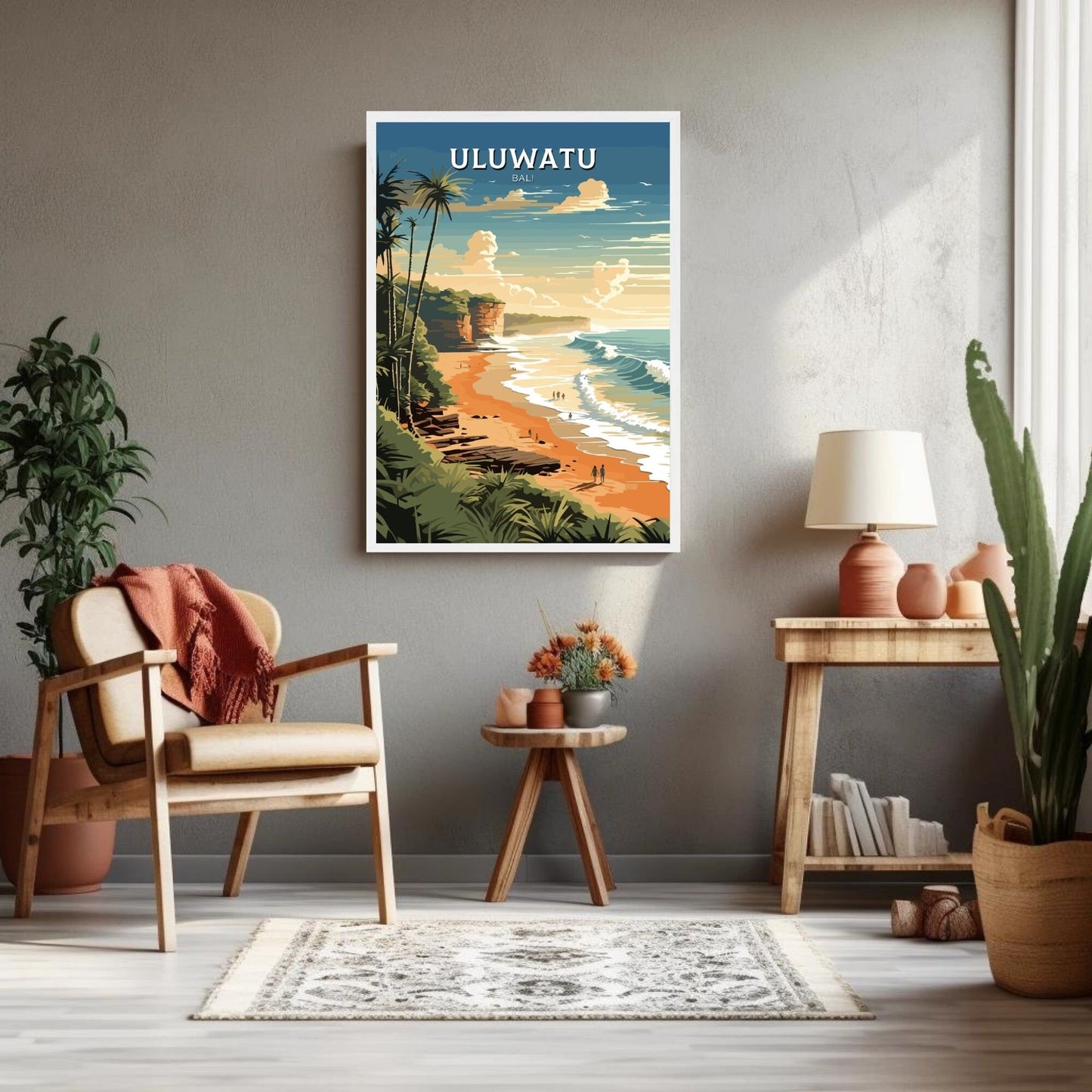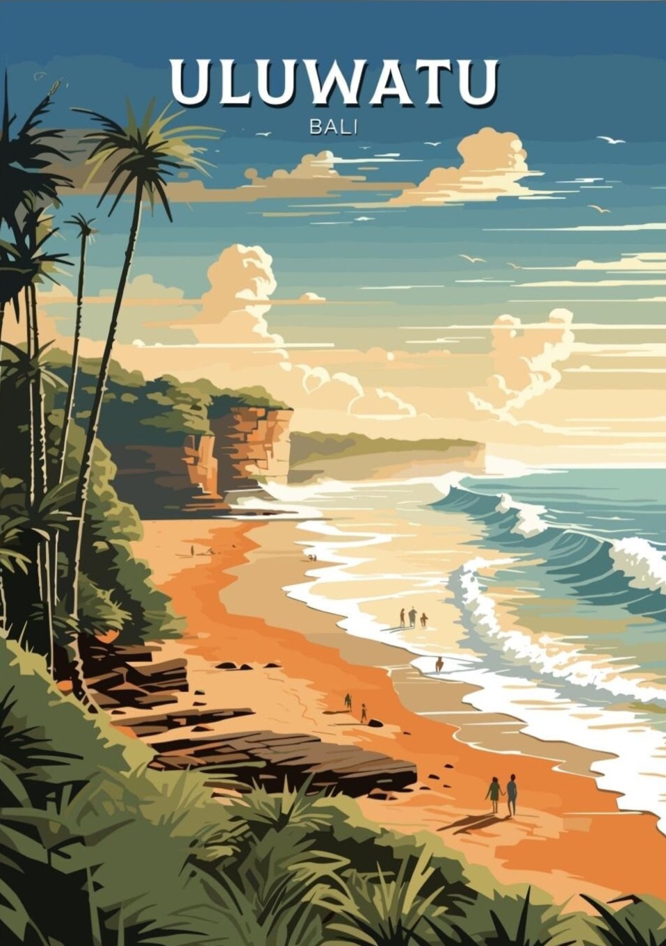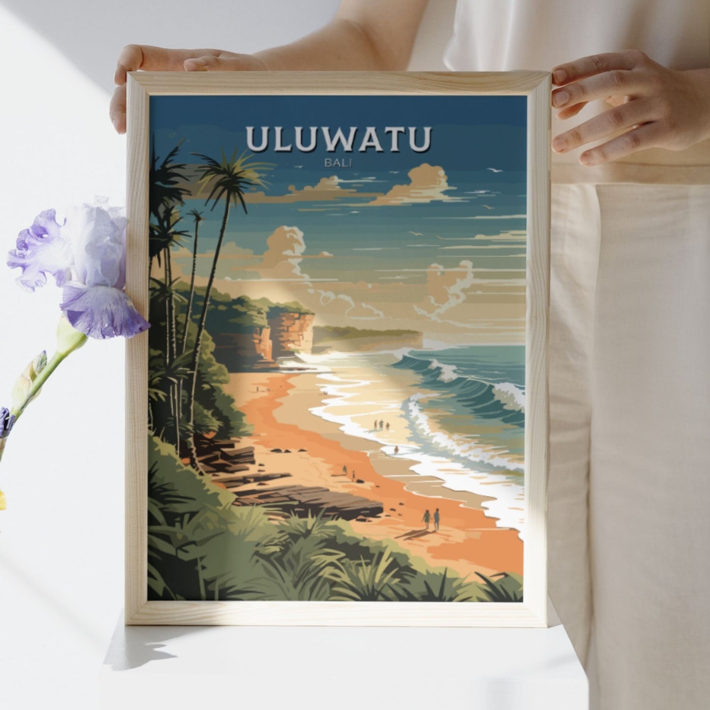 Notre affiche de voyage Uluwatu – Art rétro de Bali – plonge votre intérieur dans le charme côtier d'Uluwatu, à Bali, grâce à son design nostalgique. Parfaite pour les passionnés de voyages et les amateurs d'art rétro, elle capture le temple à flanc de falaise, les vagues déferlantes et les plages de surf dans un style intemporel. Que vous ayez visité ses côtes ou rêvé de son ambiance, cette affiche rétro d'Uluwatu sera un ajout magnifique à votre décoration.