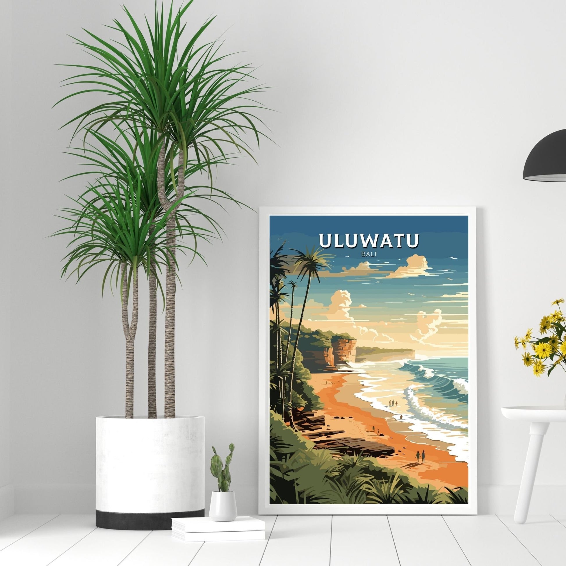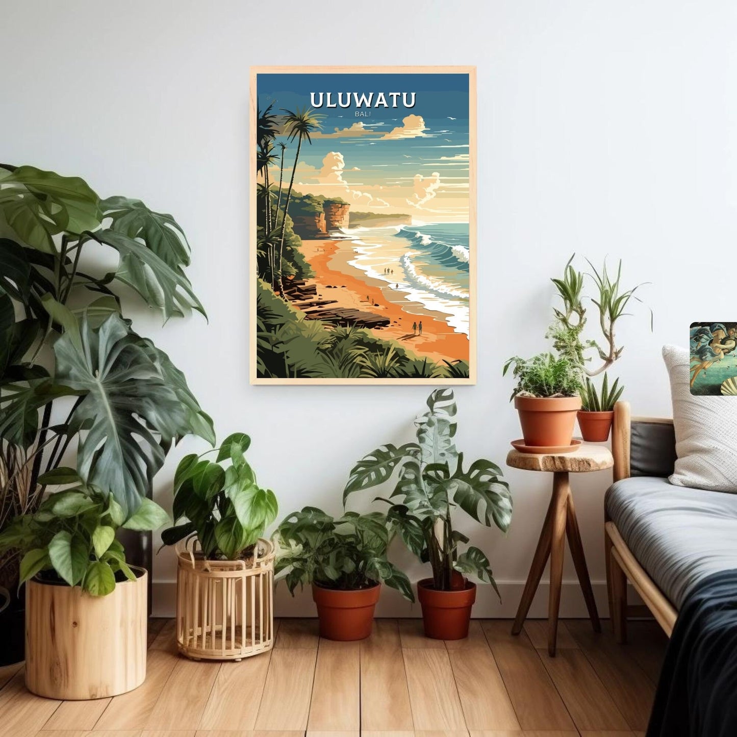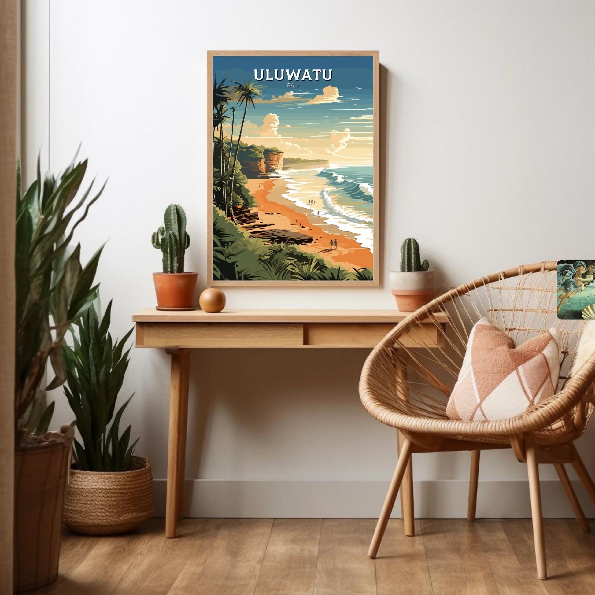 Notre affiche de voyage Uluwatu – Art rétro de Bali – plonge votre intérieur dans le charme côtier d'Uluwatu, à Bali, grâce à son design nostalgique. Parfaite pour les passionnés de voyages et les amateurs d'art rétro, elle capture le temple à flanc de falaise, les vagues déferlantes et les plages de surf dans un style intemporel. Que vous ayez visité ses côtes ou rêvé de son ambiance, cette affiche rétro d'Uluwatu sera un ajout magnifique à votre décoration.
