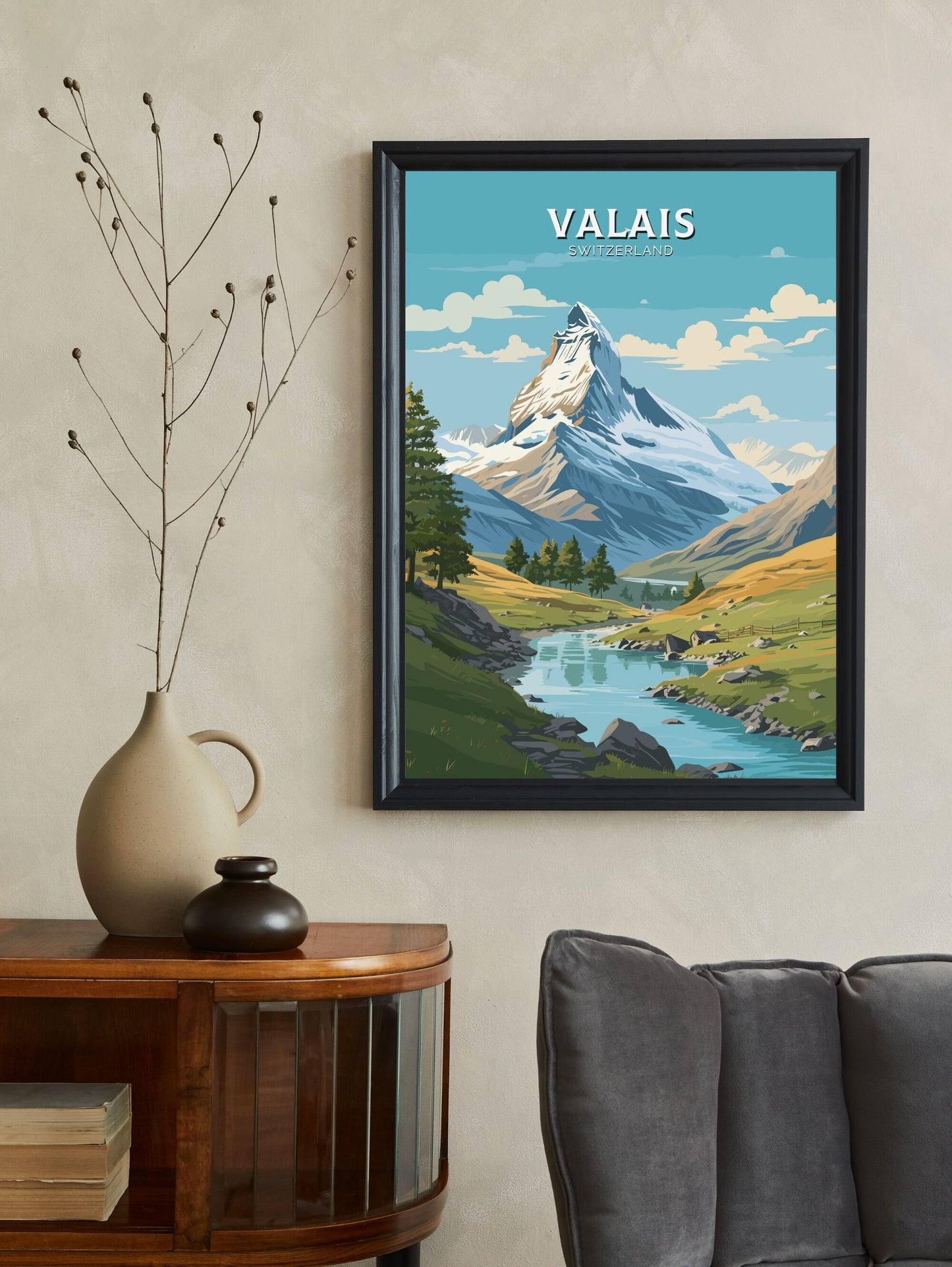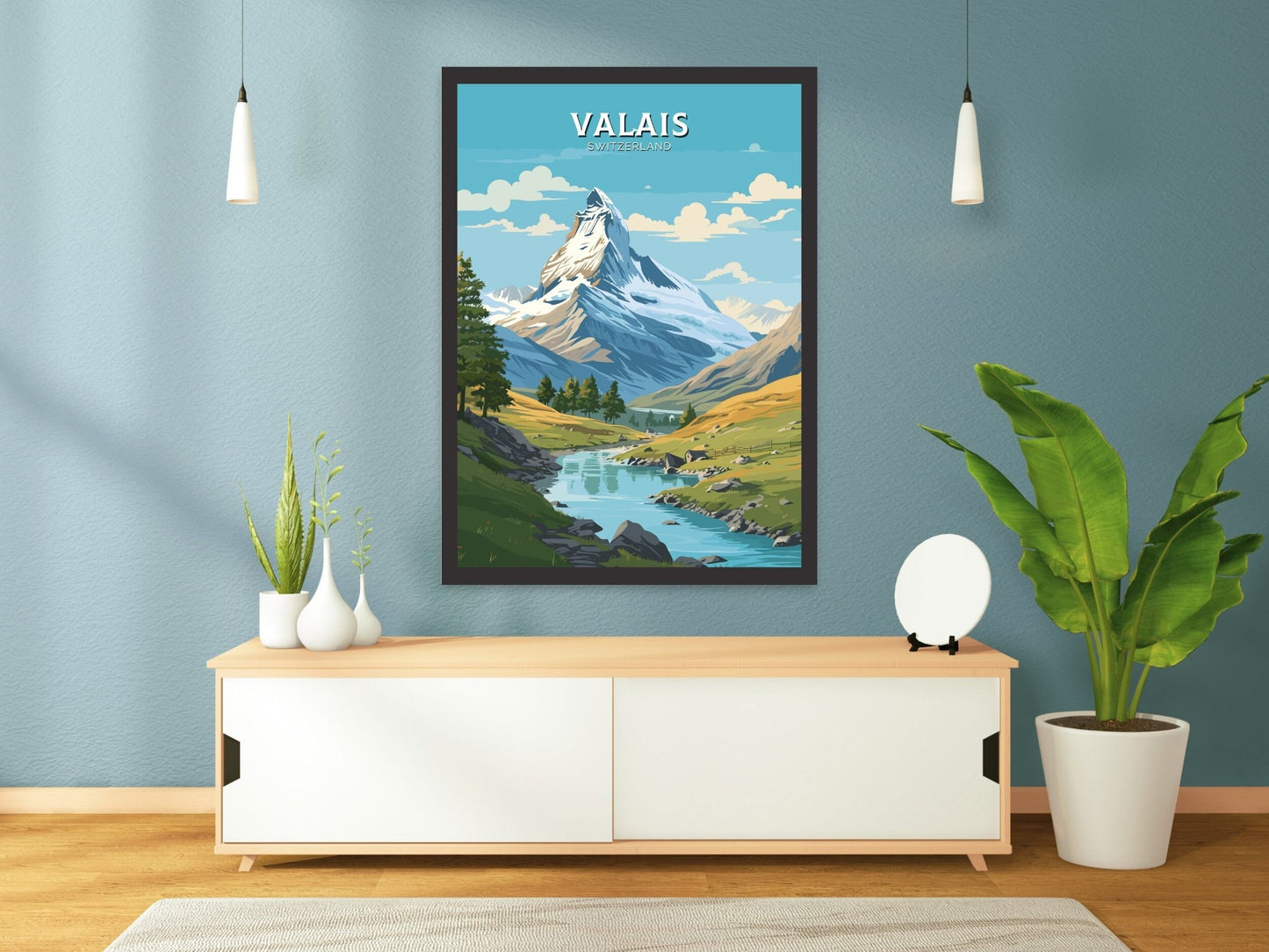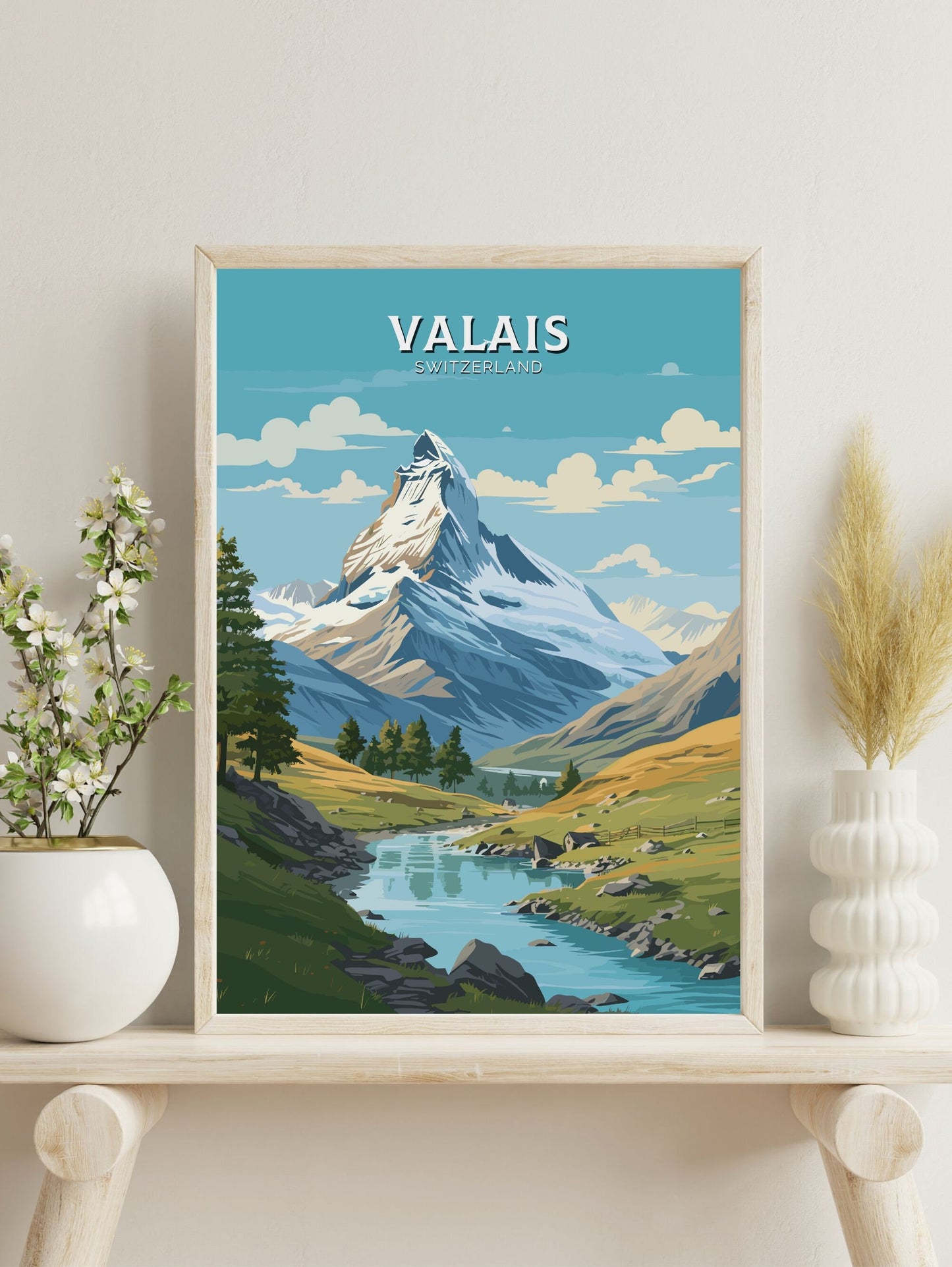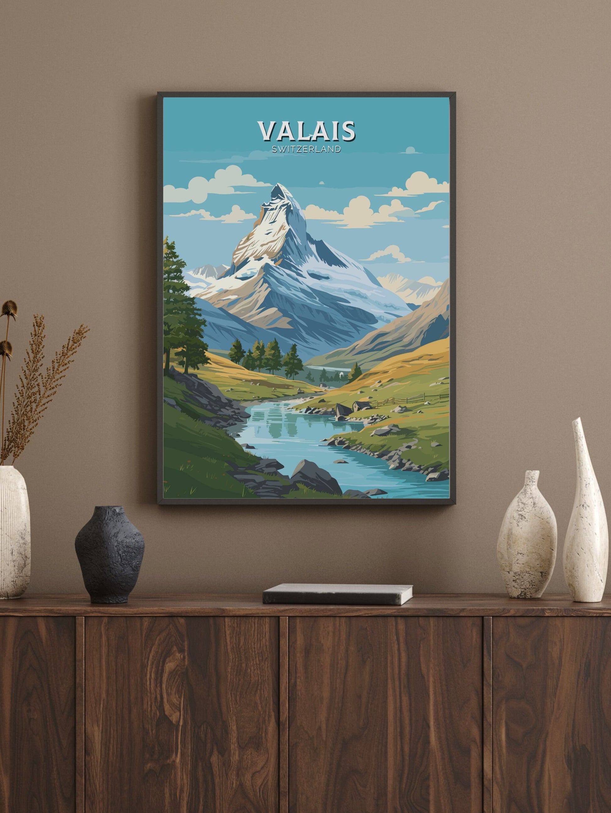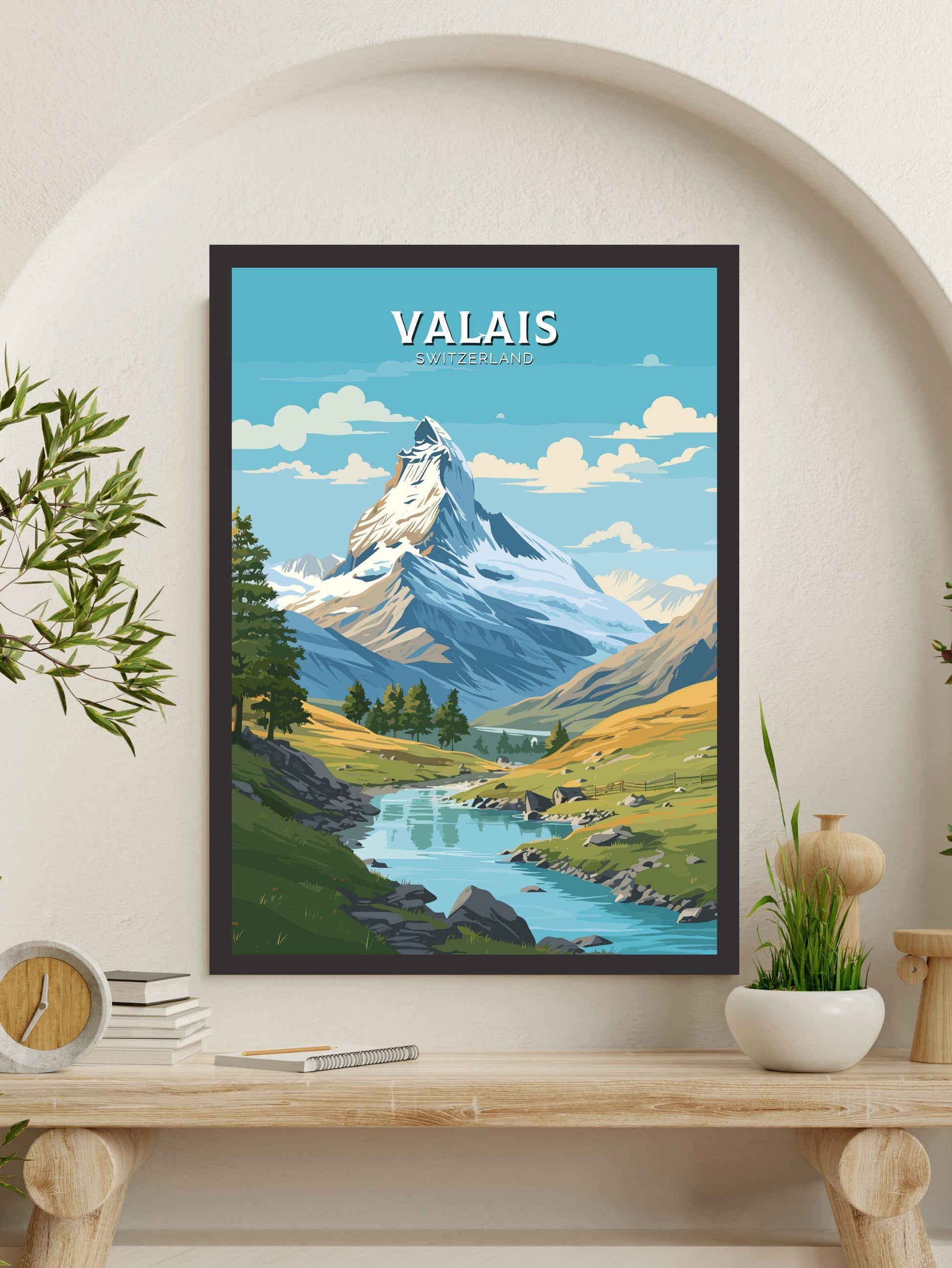 Imprimée sur un papier de haute qualité aux couleurs riches et aux détails précis, l' affiche de voyage du Valais est idéale pour décorer une galerie murale, un bureau ou un salon. Que vous commémoriez un voyage ou rêviez de votre prochaine aventure, cette affiche apporte la majesté paisible des Alpes suisses à votre quotidien.