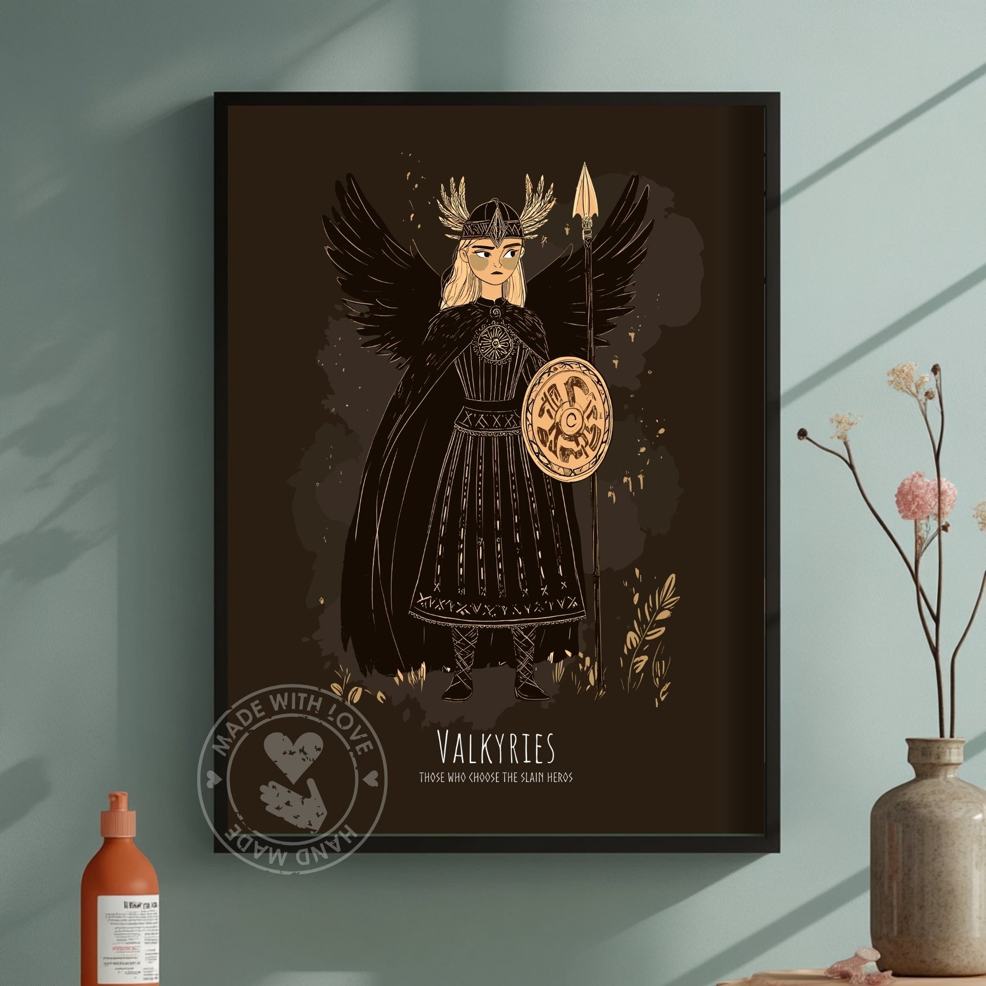 Cette affiche de mythologie nordique des Valkyries représente les féroces jeunes filles d'Odin, ailes déployées dans la gloire du combat. Elle capture la détermination inébranlable des Valkyries, tissée dans les fils audacieux du folklore nordique.