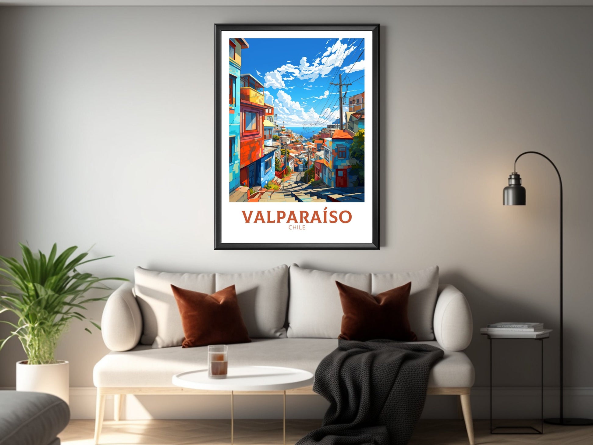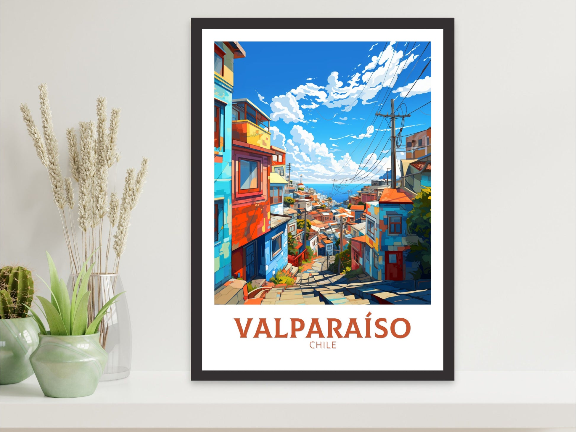 Notre affiche d'art Valparaíso – Ambiance rétro de la ville portuaire plonge votre intérieur dans l'âme vibrante de Valparaíso, au Chili, grâce à son design nostalgique. Idéale pour les passionnés de voyages et d'art rétro, elle capture les collines colorées et le street art de la ville dans un style intemporel. Que vous ayez arpenté ses rues ou rêvé de son charme, cette affiche rétro Valparaíso sera un ajout magnifique à votre décoration.