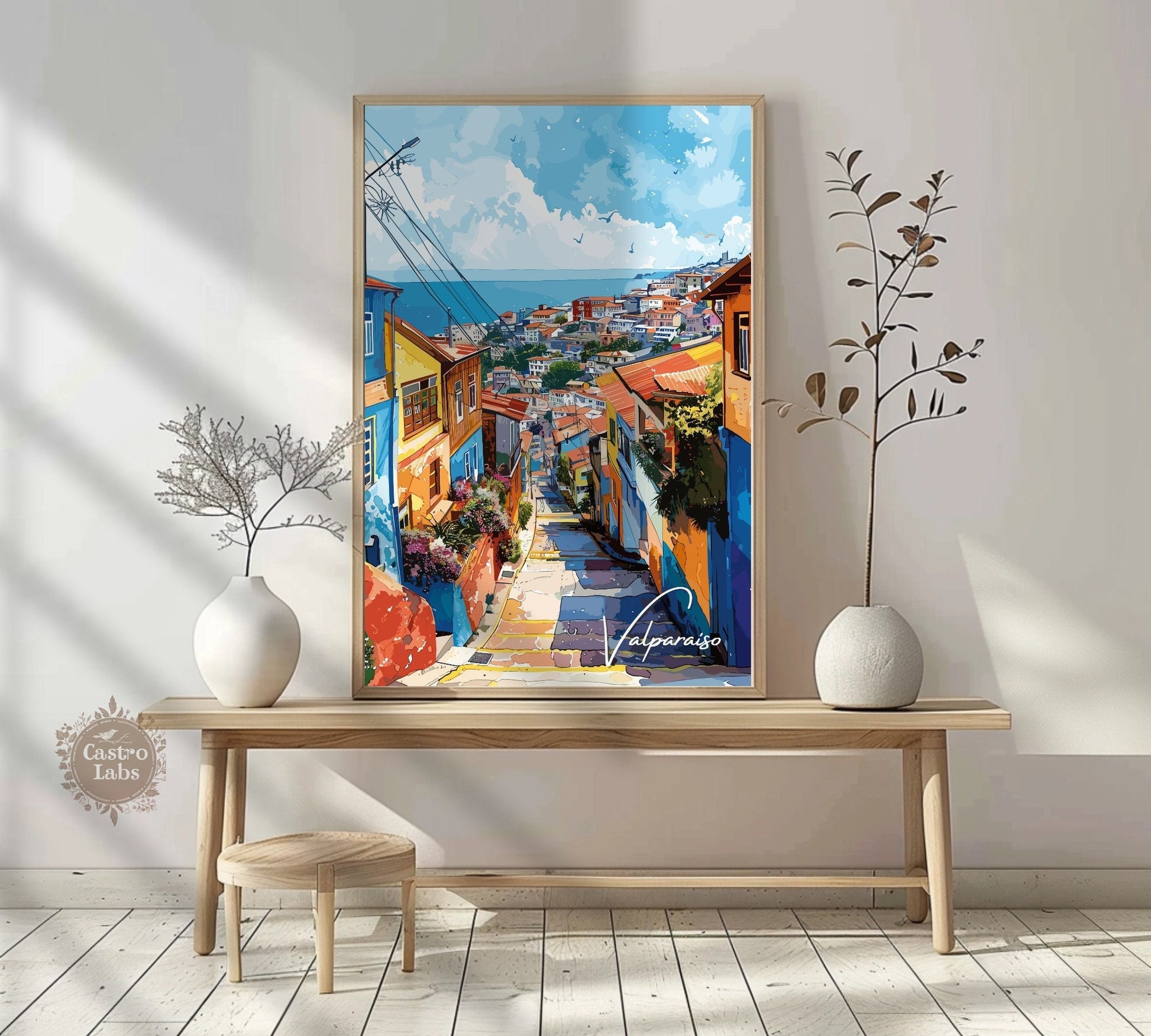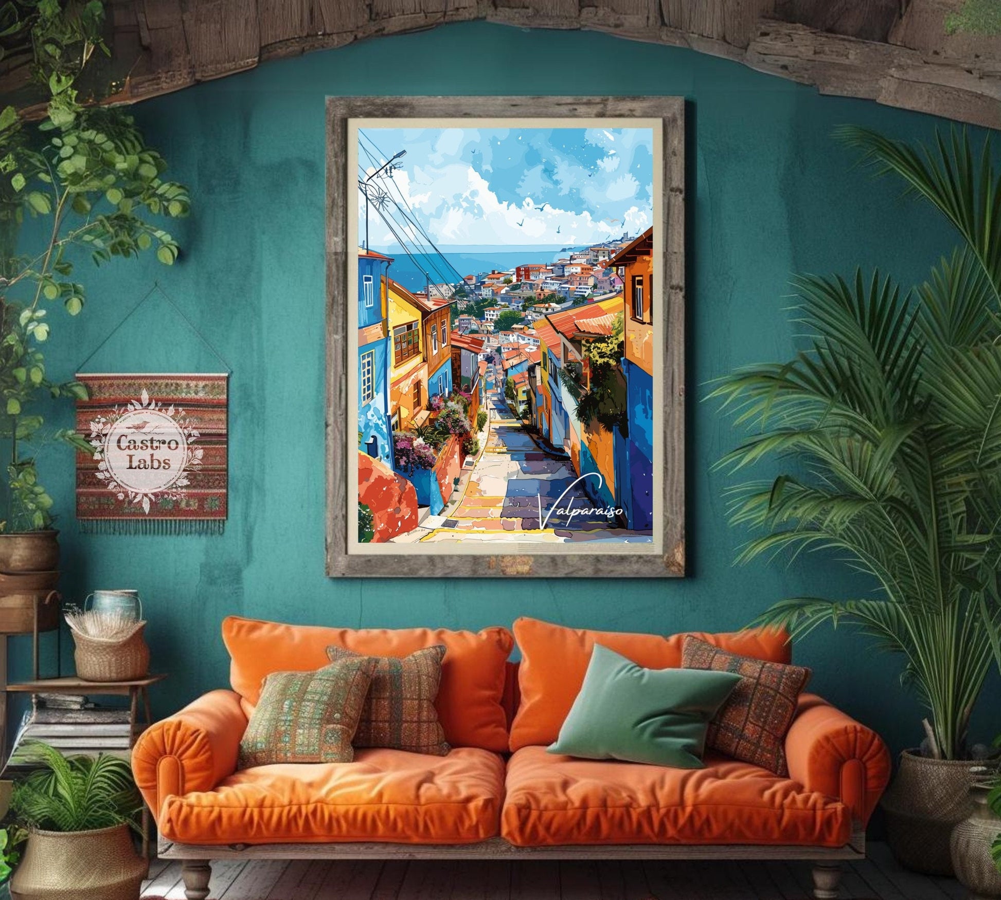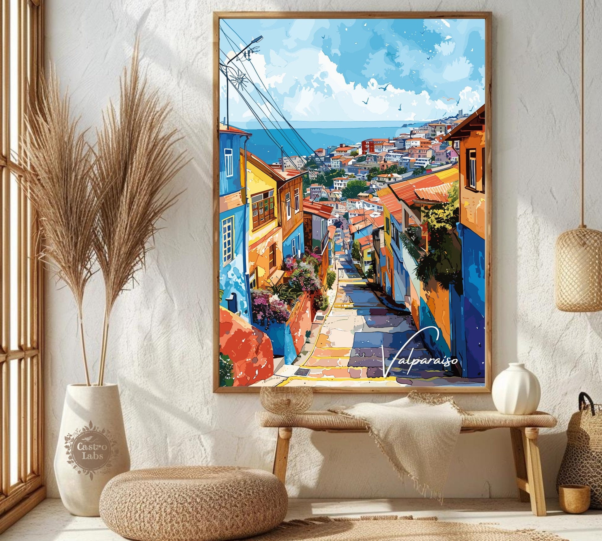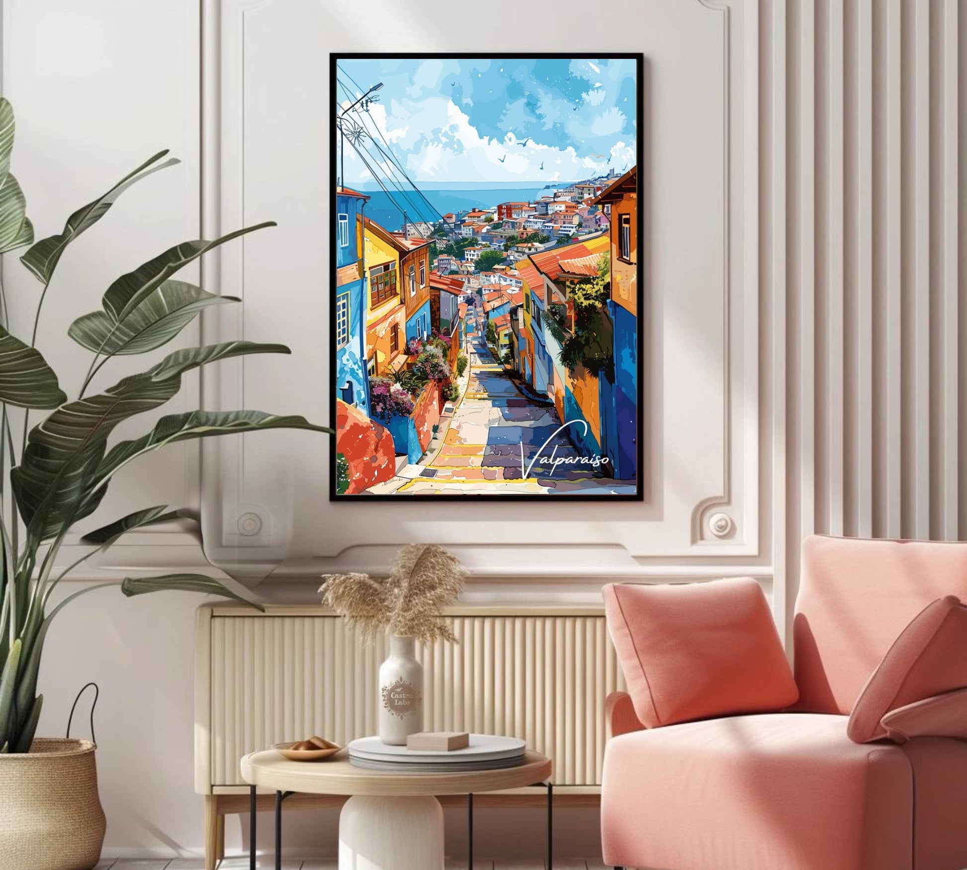 Notre affiche vintage Valparaíso – Art côtier chilien plonge votre intérieur dans l'âme vibrante de Valparaíso, au Chili, grâce à son design nostalgique. Idéale pour les passionnés de voyages et d'art rétro, elle capture les collines colorées et le street art de la ville dans un style intemporel. Que vous ayez arpenté ses rues ou rêvé de son charme, cette affiche vintage Valparaíso sera un atout déco exceptionnel.
