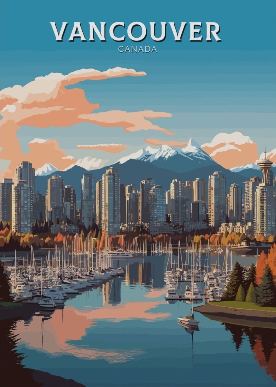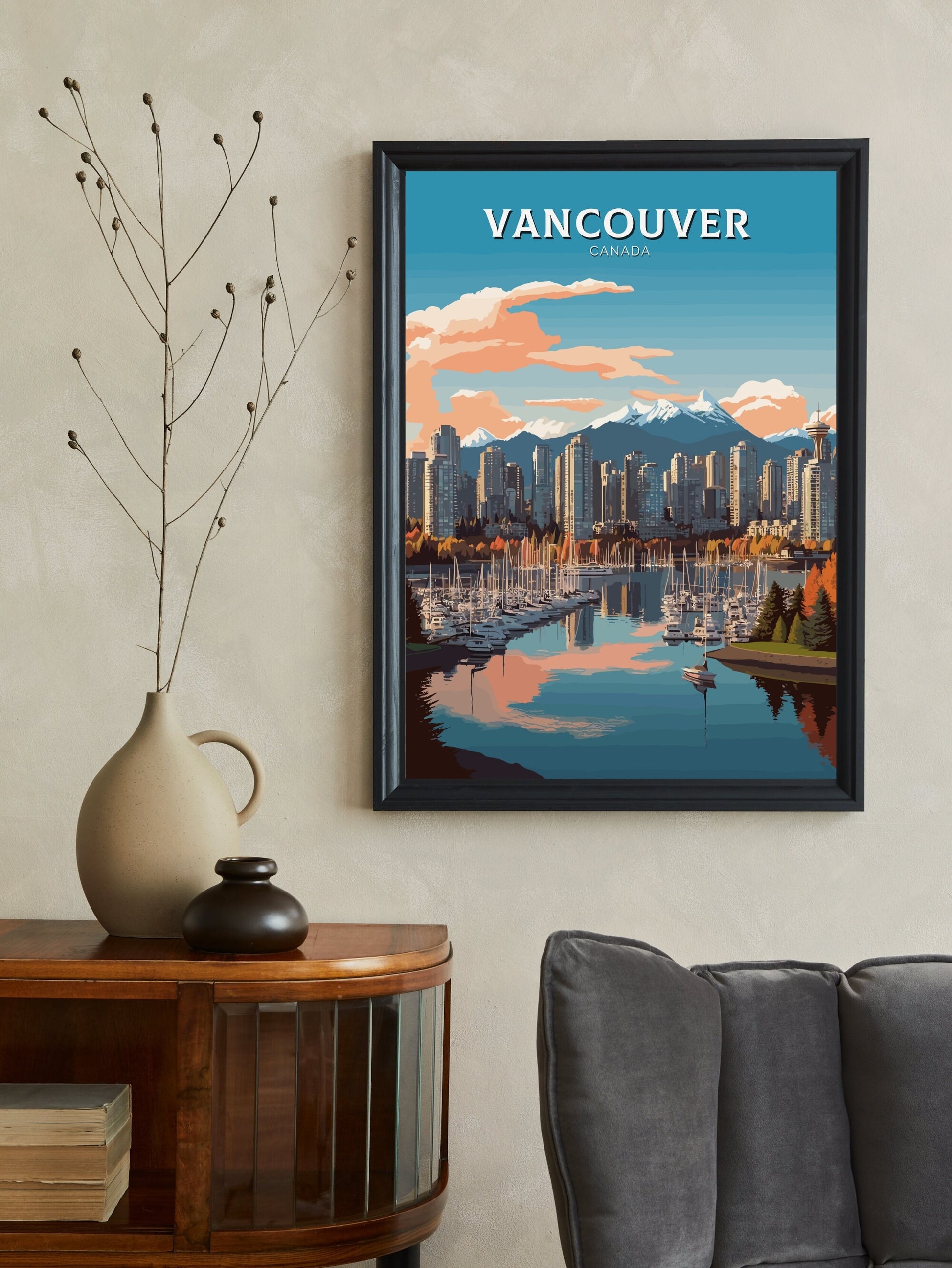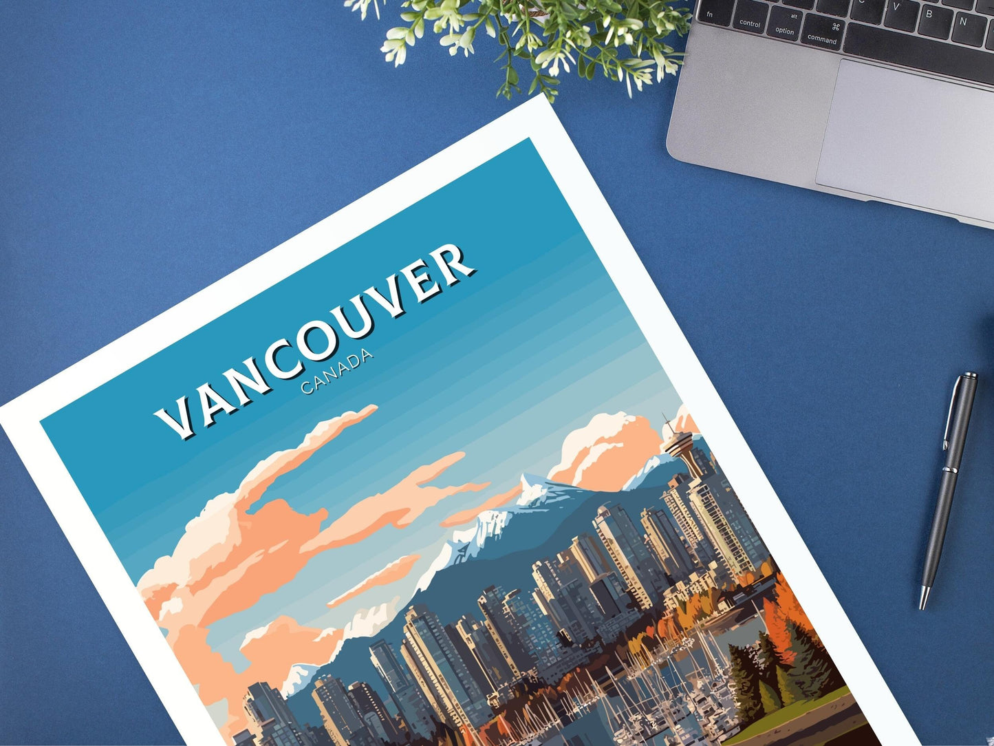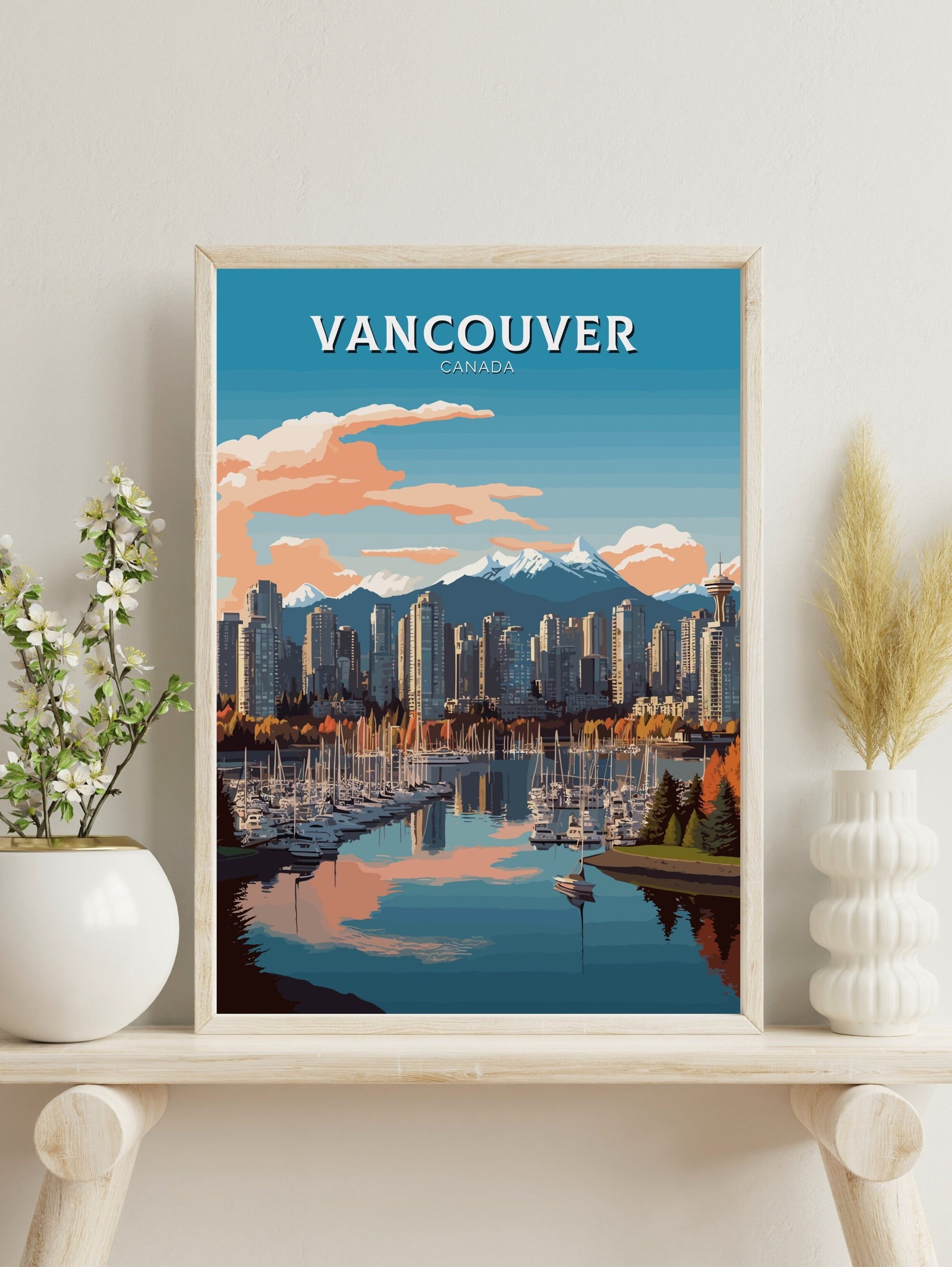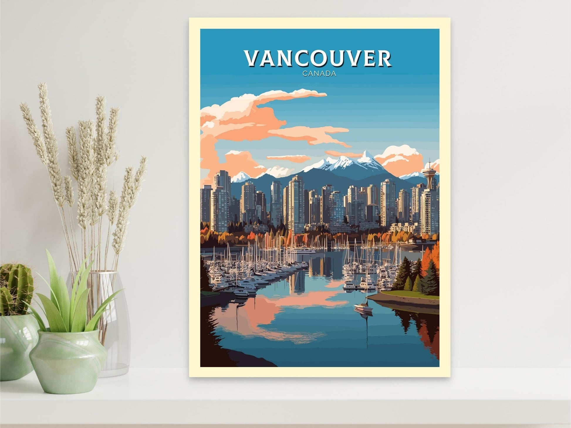 Faisant partie de notre collection d'affiches de voyage en Amérique du Nord , cette affiche de voyage de Vancouver se marie à merveille avec d'autres impressions de villes et de parcs nationaux canadiens, idéales pour les amateurs de voyages, les collectionneurs ou comme cadeau unique.
