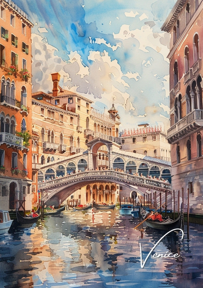 Plongez dans la beauté enchanteresse de Venise avec cette élégante affiche de voyage . Mettant en vedette des monuments emblématiques tels que des gondoles naviguant sur des canaux paisibles, des ponts historiques et une architecture époustouflante, cette œuvre capture parfaitement le romantisme et le charme intemporel de la ville flottante italienne.
