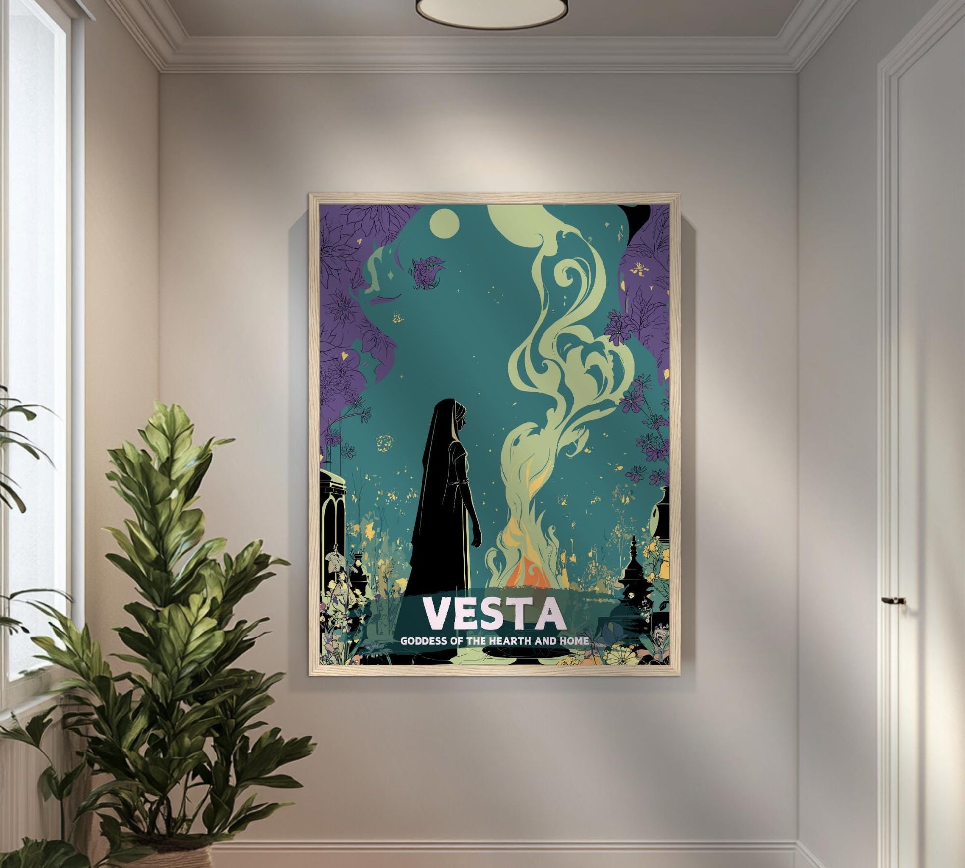 Honorez la flamme sacrée de la tradition romaine avec cette affiche de la déesse Vesta – Œuvre d'art mythologique romaine . Vesta, déesse du foyer, de la maison et de la famille, symbolise la chaleur, la protection et l'harmonie familiale. Cette œuvre magnifiquement détaillée capture sa présence sereine, ce qui en fait une pièce idéale pour les passionnés de mythologie, les passionnés d'histoire et les collectionneurs d'art classique.