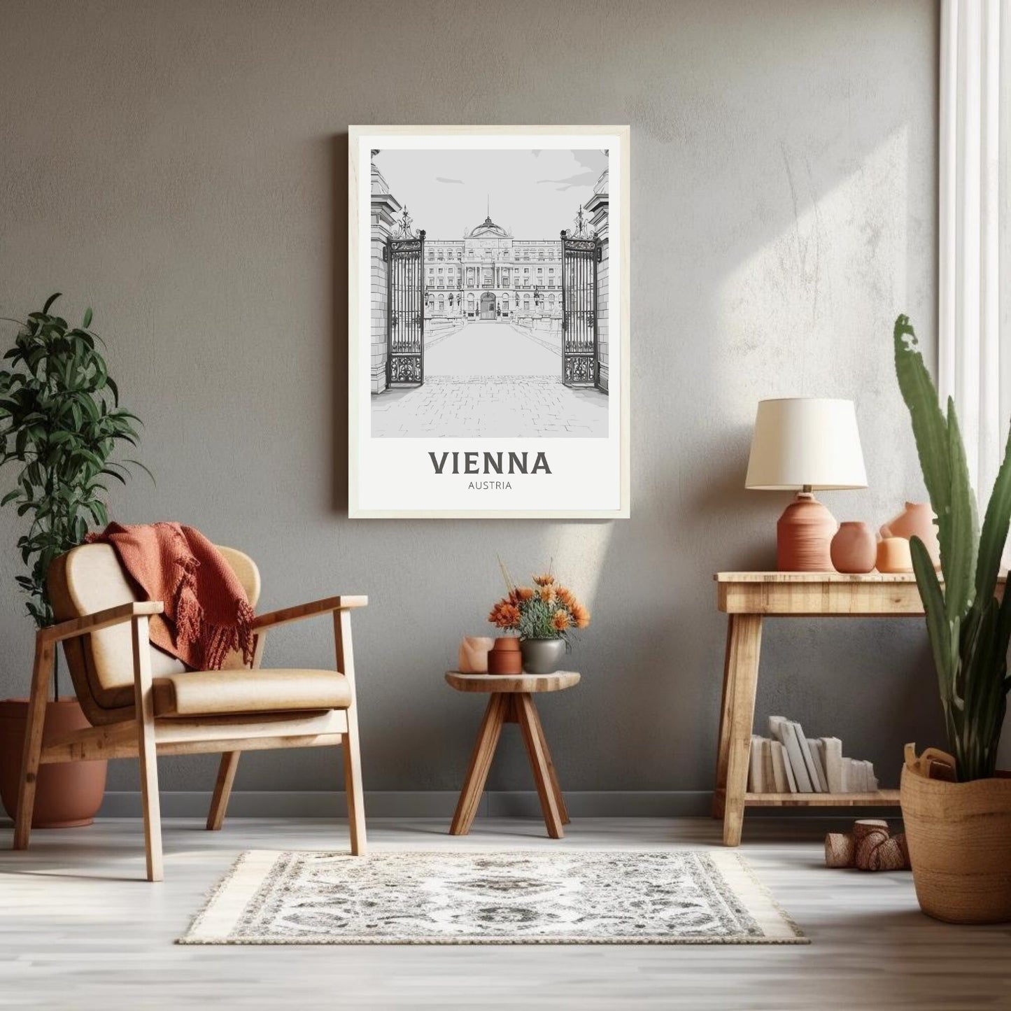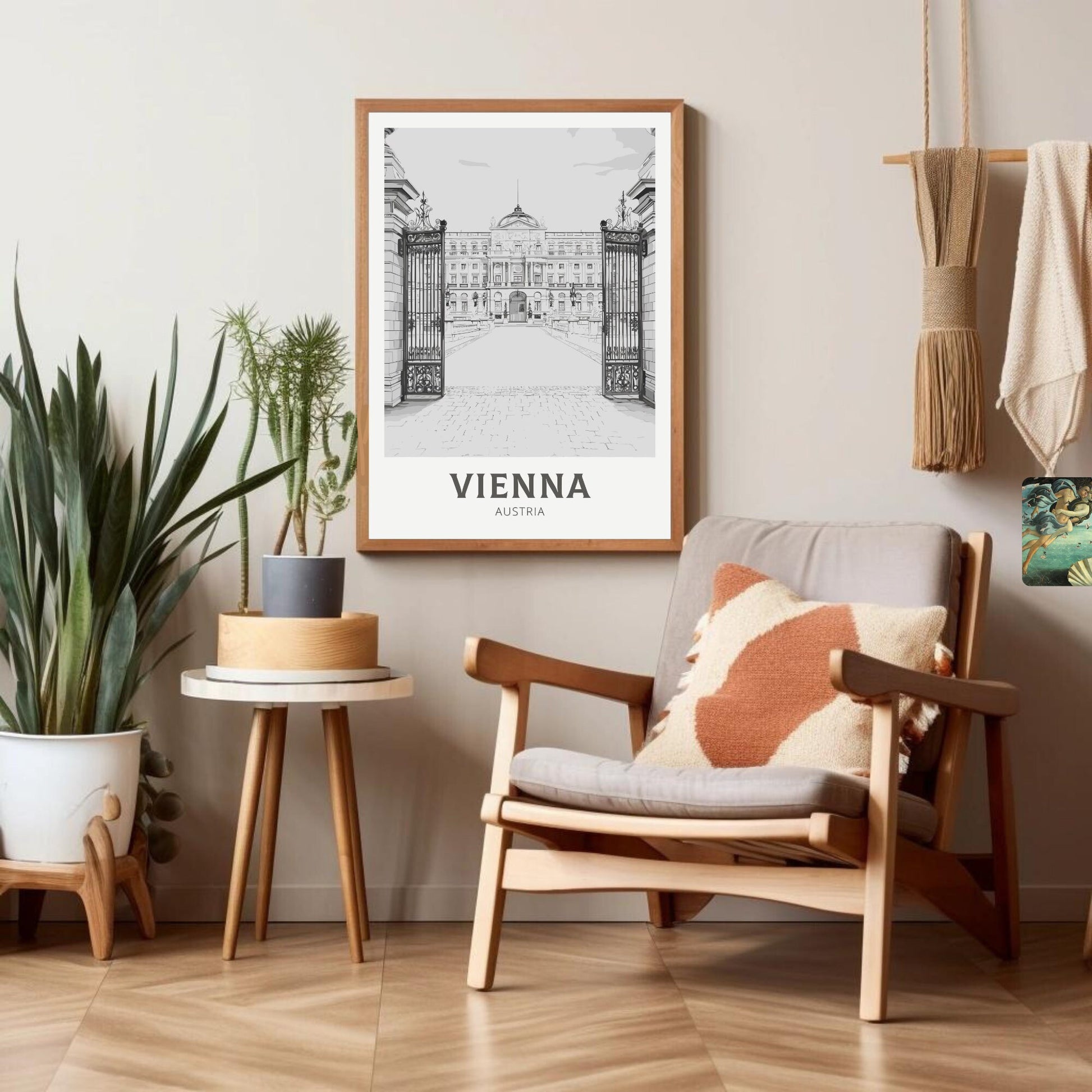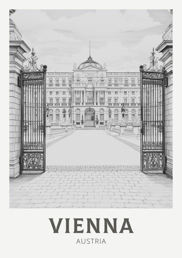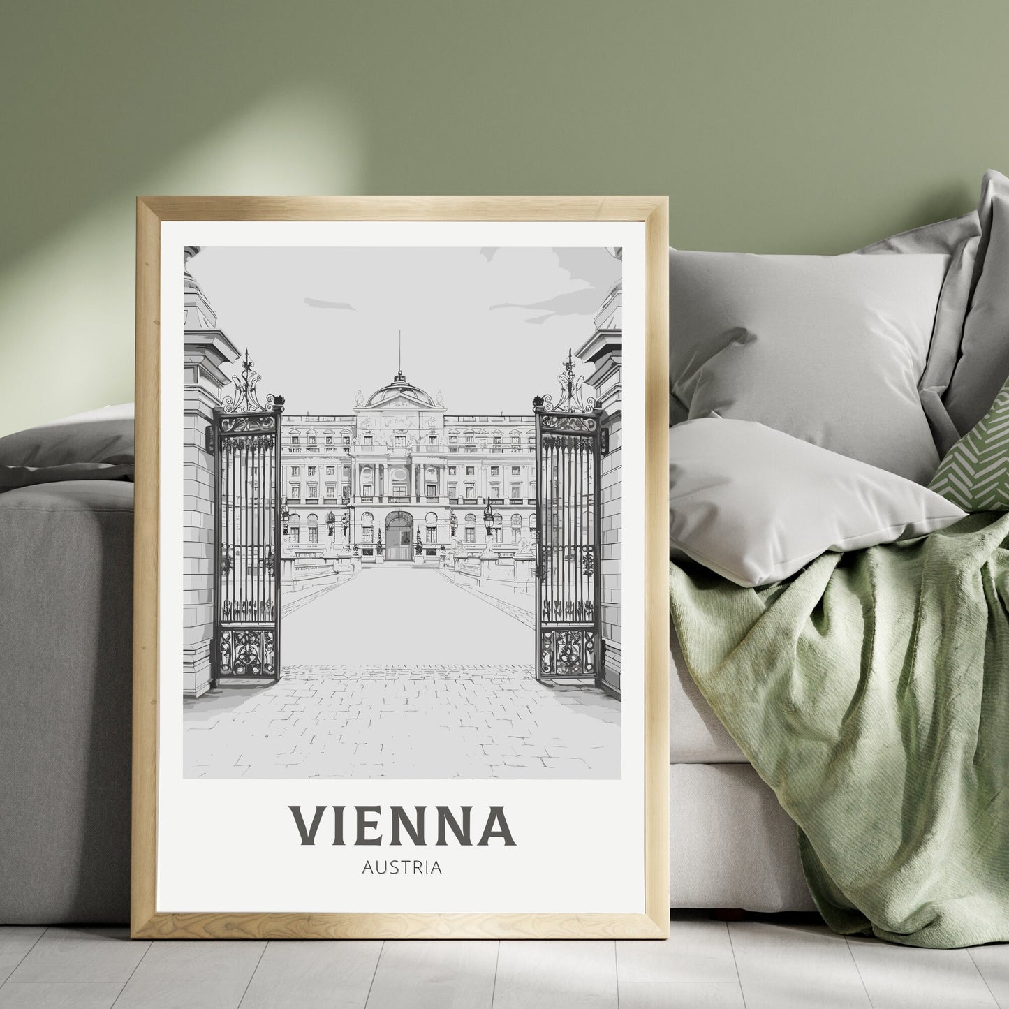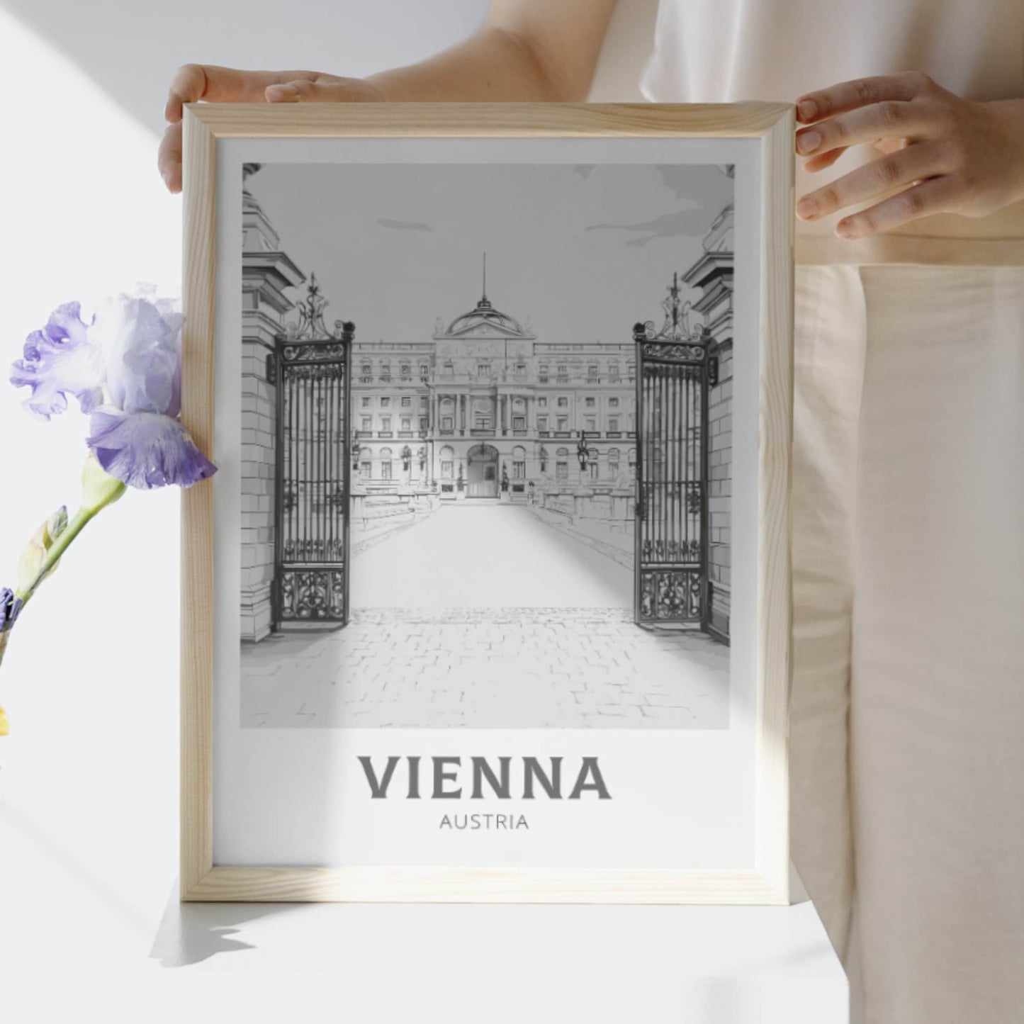 Célébrez la beauté culturelle de l'Autriche avec cette affiche de voyage noir et blanc de Vienne . Mettant en valeur l'architecture époustouflante de la ville, ses rues élégantes et son charme intemporel, cette œuvre monochrome met en valeur la sophistication viennoise dans un style minimaliste.