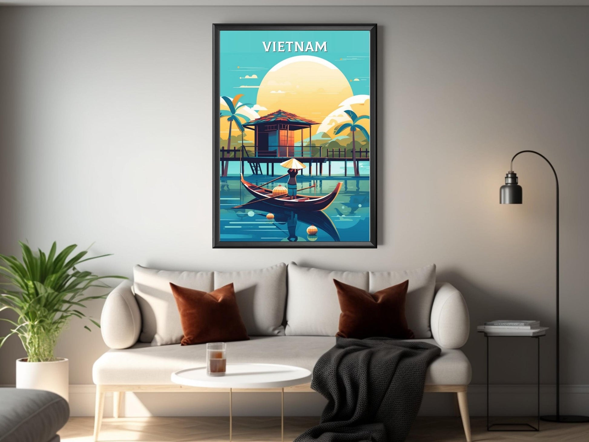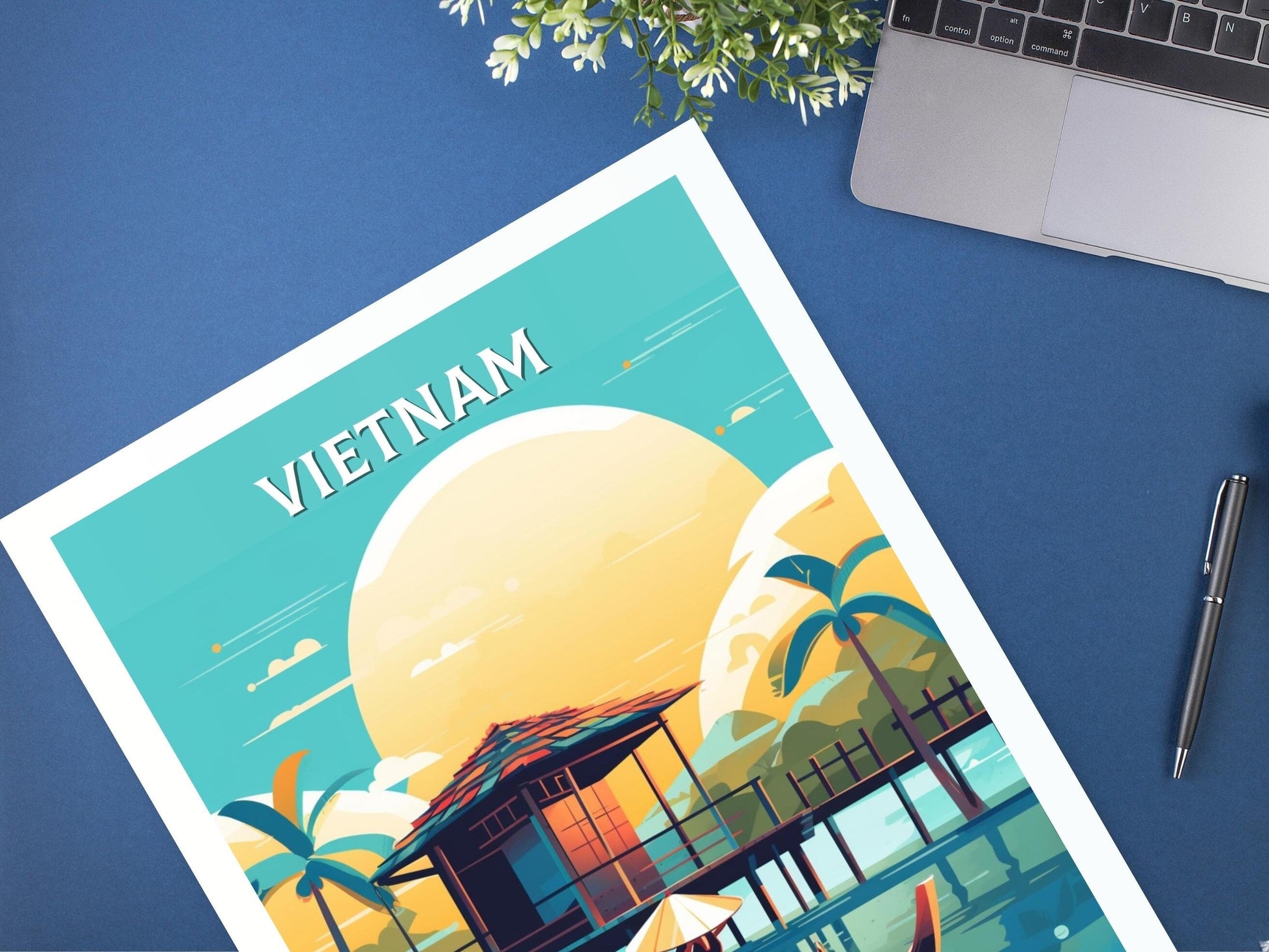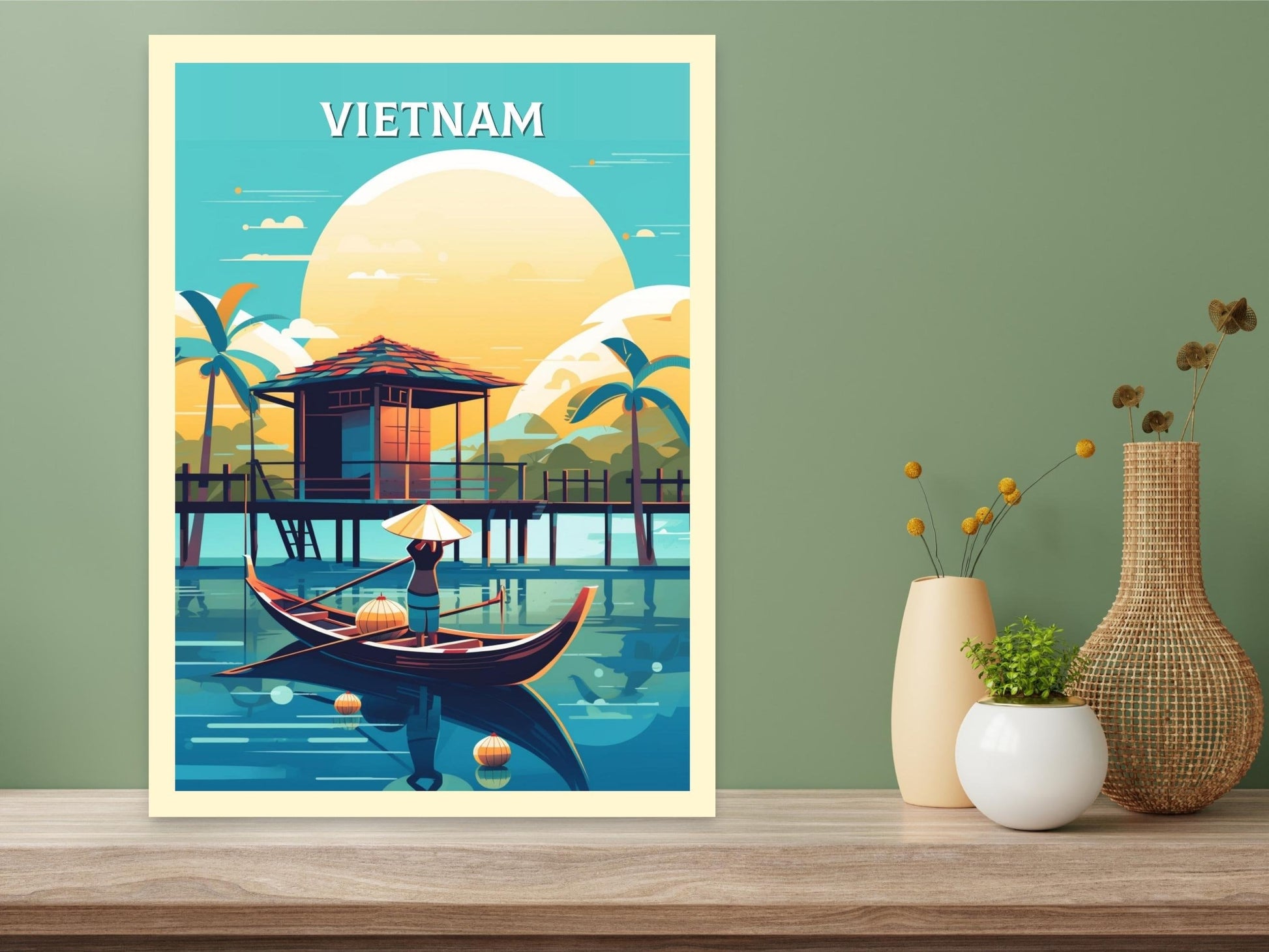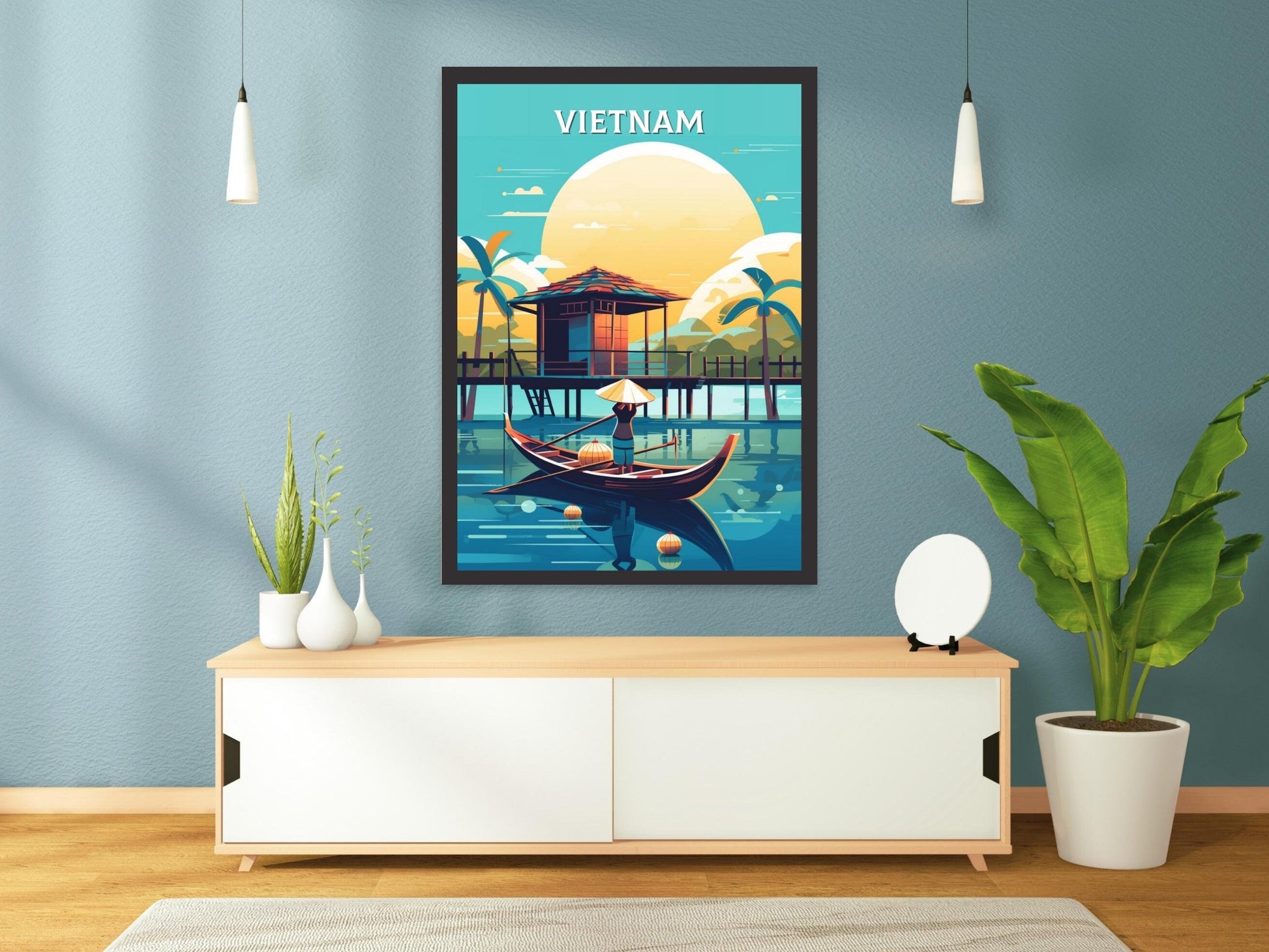 Notre affiche vintage Vietnam plonge votre intérieur dans le charme intemporel du Vietnam grâce à son design nostalgique. Idéale pour les passionnés de voyages et d'art rétro, elle capture les rizières luxuriantes, les temples anciens et les deltas animés du pays dans un style classique. Que vous ayez exploré ses paysages ou rêvé de son charme, cette affiche vintage Vietnam sera un ajout magnifique à votre décoration.