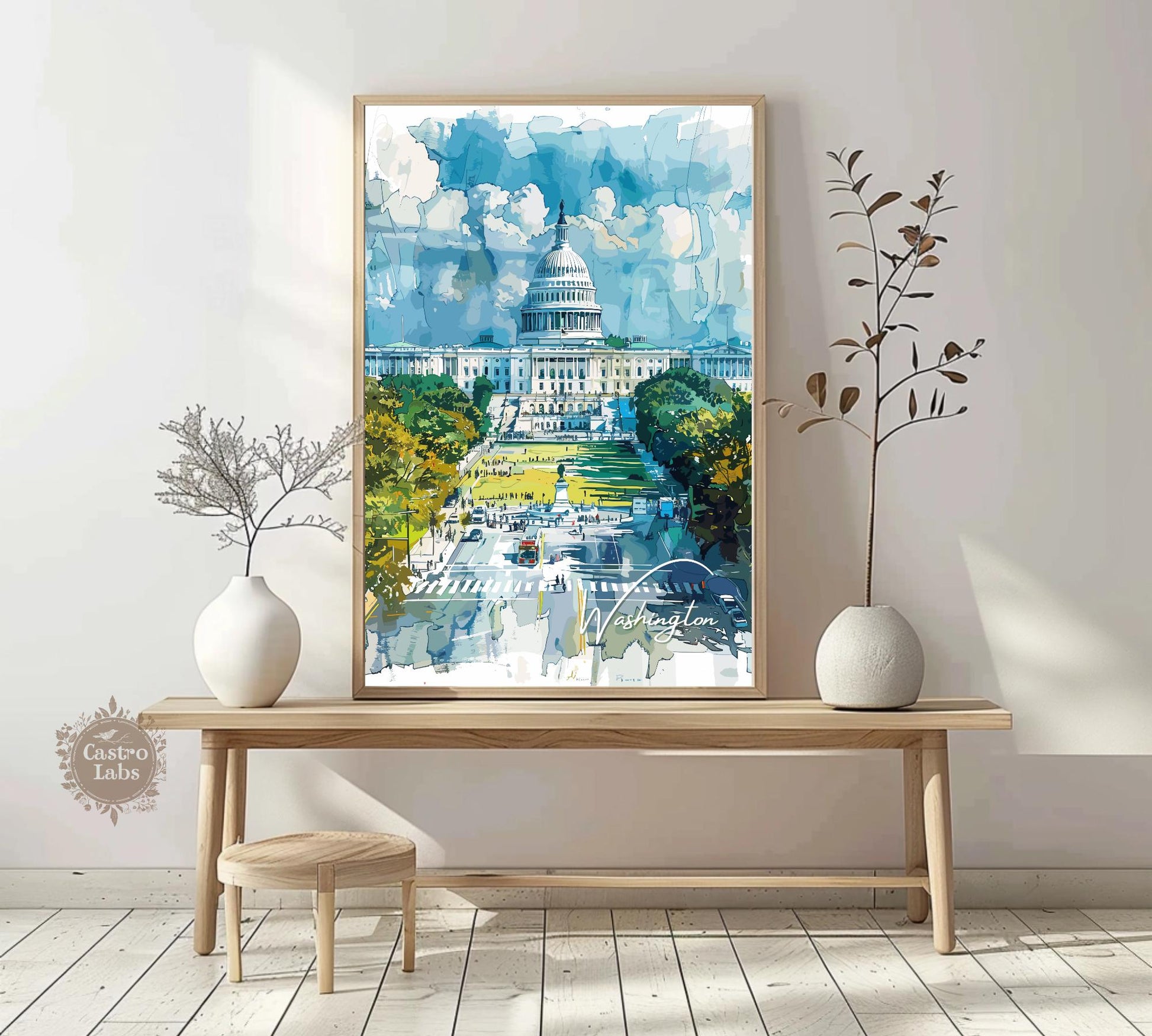 Imprimée sur du papier de qualité supérieure, cette affiche de voyage de Washington DC est disponible en plusieurs formats, idéale pour la maison, le bureau ou comme cadeau attentionné. Associez-la à d'autres affiches de monuments américains pour une décoration murale harmonieuse inspirée du voyage.