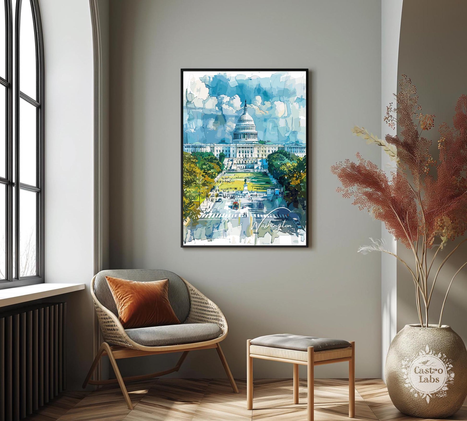 Ajoutez une touche d'élégance à votre espace avec notre aquarelle de voyage Washington DC – Illustration de la Maison Blanche . Cette représentation artistique de l'emblématique Maison Blanche capture le charme de la capitale du pays dans des tons aquarelle délicats, parfaits pour les amateurs d'art, les voyageurs et les passionnés d'histoire.