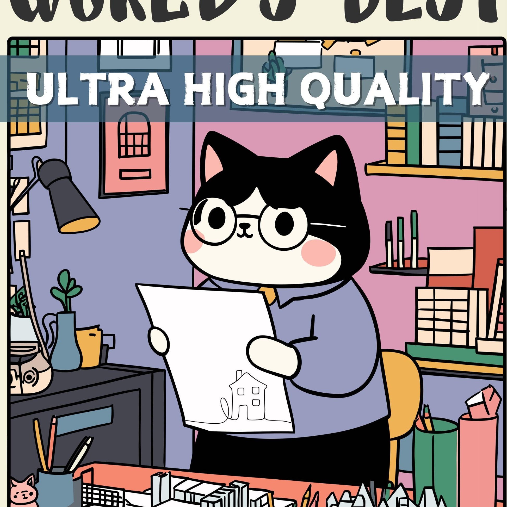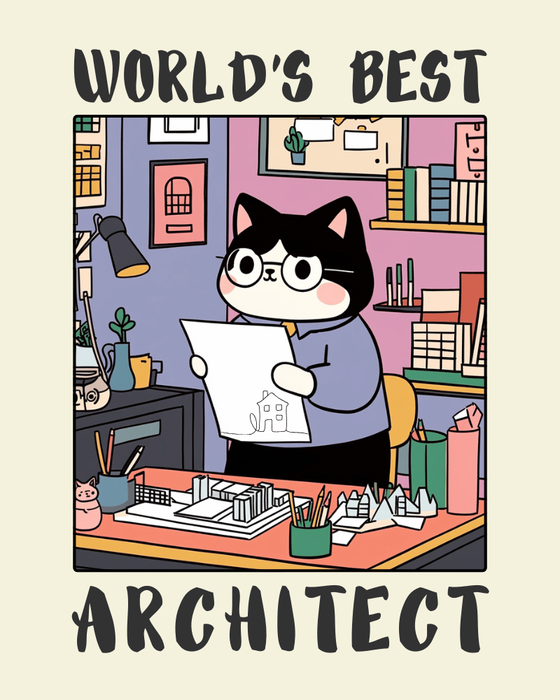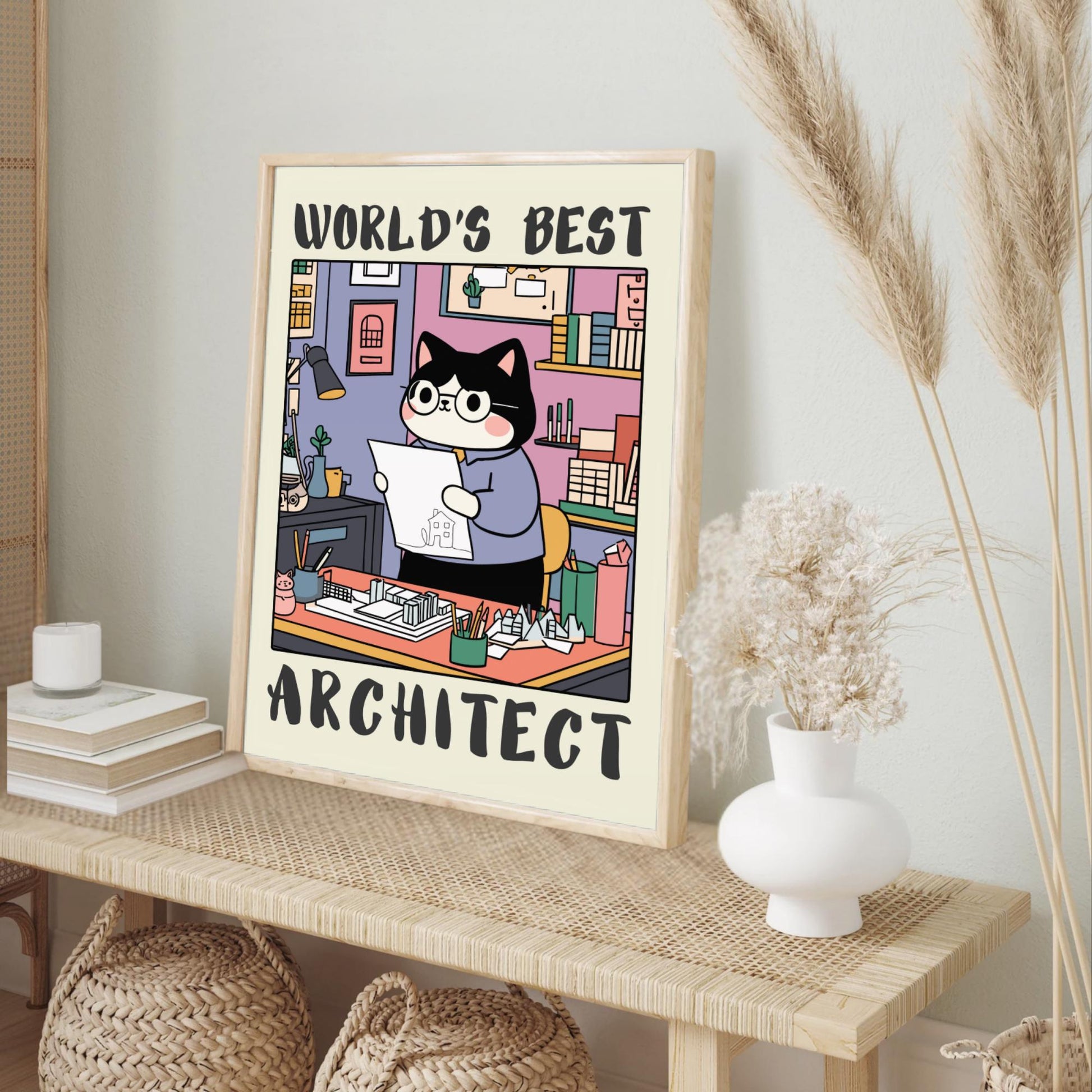 Le design rencontre la créativité avec notre affiche « Meilleur Architecte du Monde » , une œuvre d'art unique et originale, idéale comme cadeau pour les architectes. Issue de notre collection « Chats Métiers » , cette création met en scène un adorable chat en architecte de talent, avec plans, outils de dessin et espace de travail créatif. Un hommage ludique aux visionnaires qui donnent vie aux structures et aux espaces.