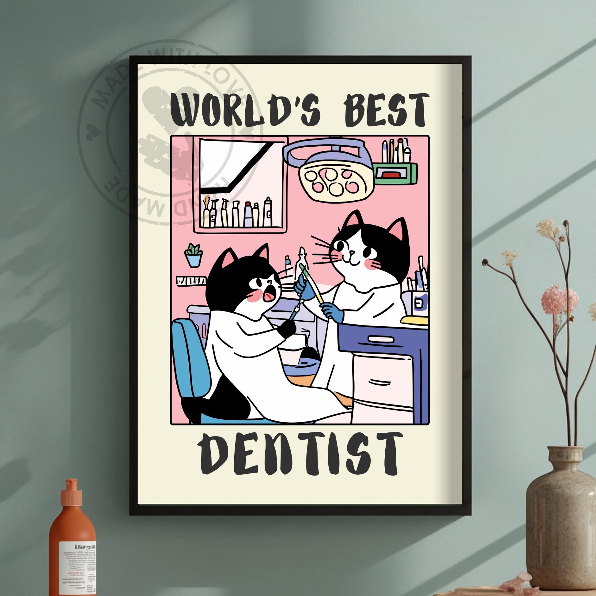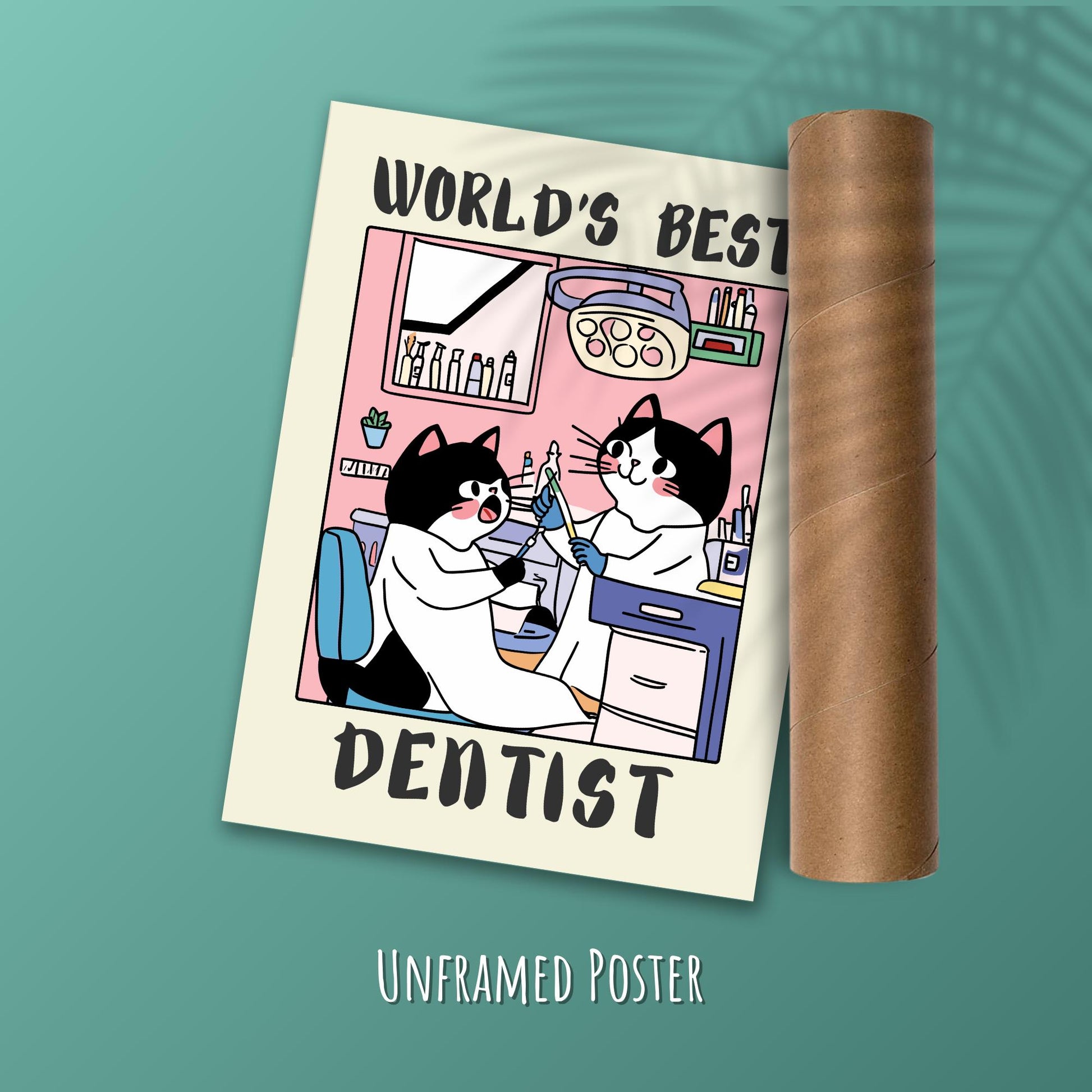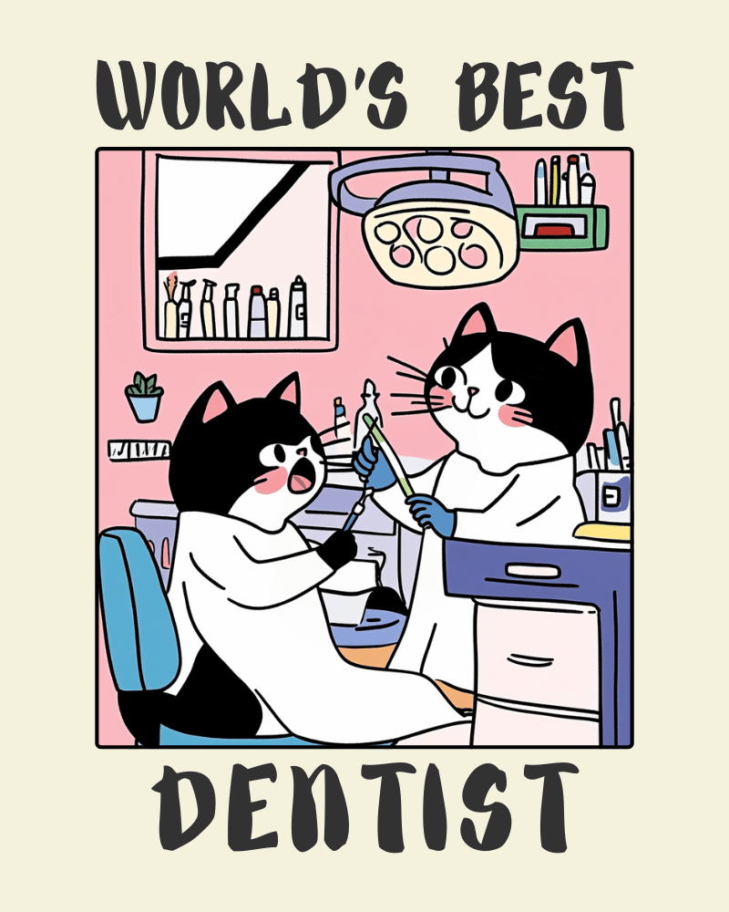 Faites sourire vos proches avec notre affiche « Meilleur Dentiste du Monde » , une œuvre d'art murale humoristique et créative, idéale comme cadeau humoristique pour les dentistes. Issue de notre collection ludique « Professions Cat » , cette affiche met en scène un adorable chat en dentiste dévoué, entouré d'instruments dentaires et d'un cabinet dentaire convivial. Une façon ludique de célébrer la dentisterie et les professionnels qui veillent à la santé de nos dents.