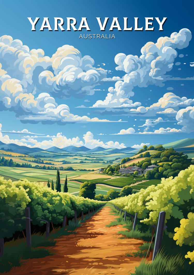 Découvrez la beauté pittoresque et les vignobles renommés de la vallée de la Yarra, dans le Victoria, grâce à cette élégante affiche de voyage . Mettant en valeur des collines vallonnées, des vignobles luxuriants et de charmants paysages champêtres, cette œuvre capture l'esprit paisible de l'une des plus prestigieuses régions viticoles d'Australie.