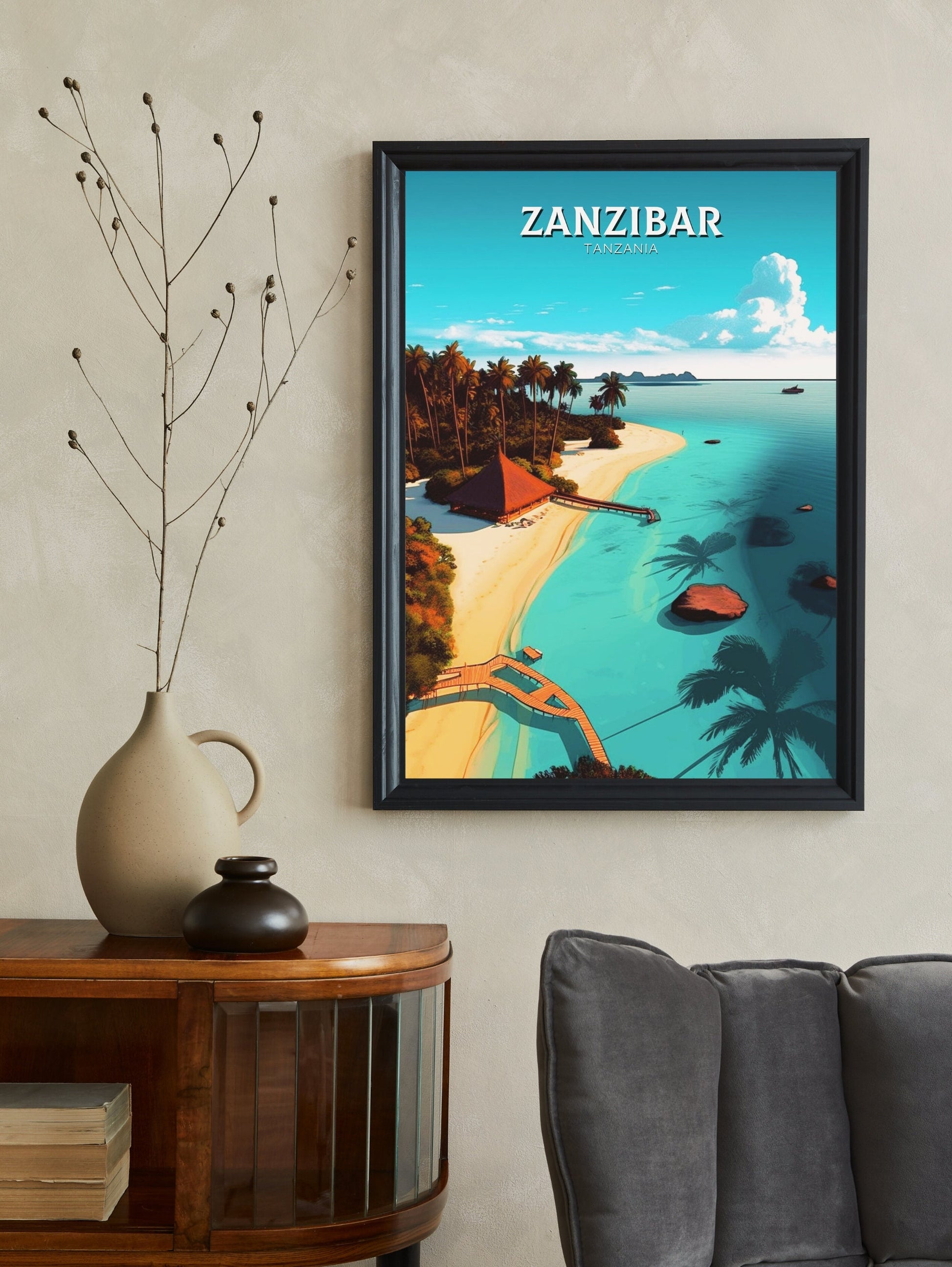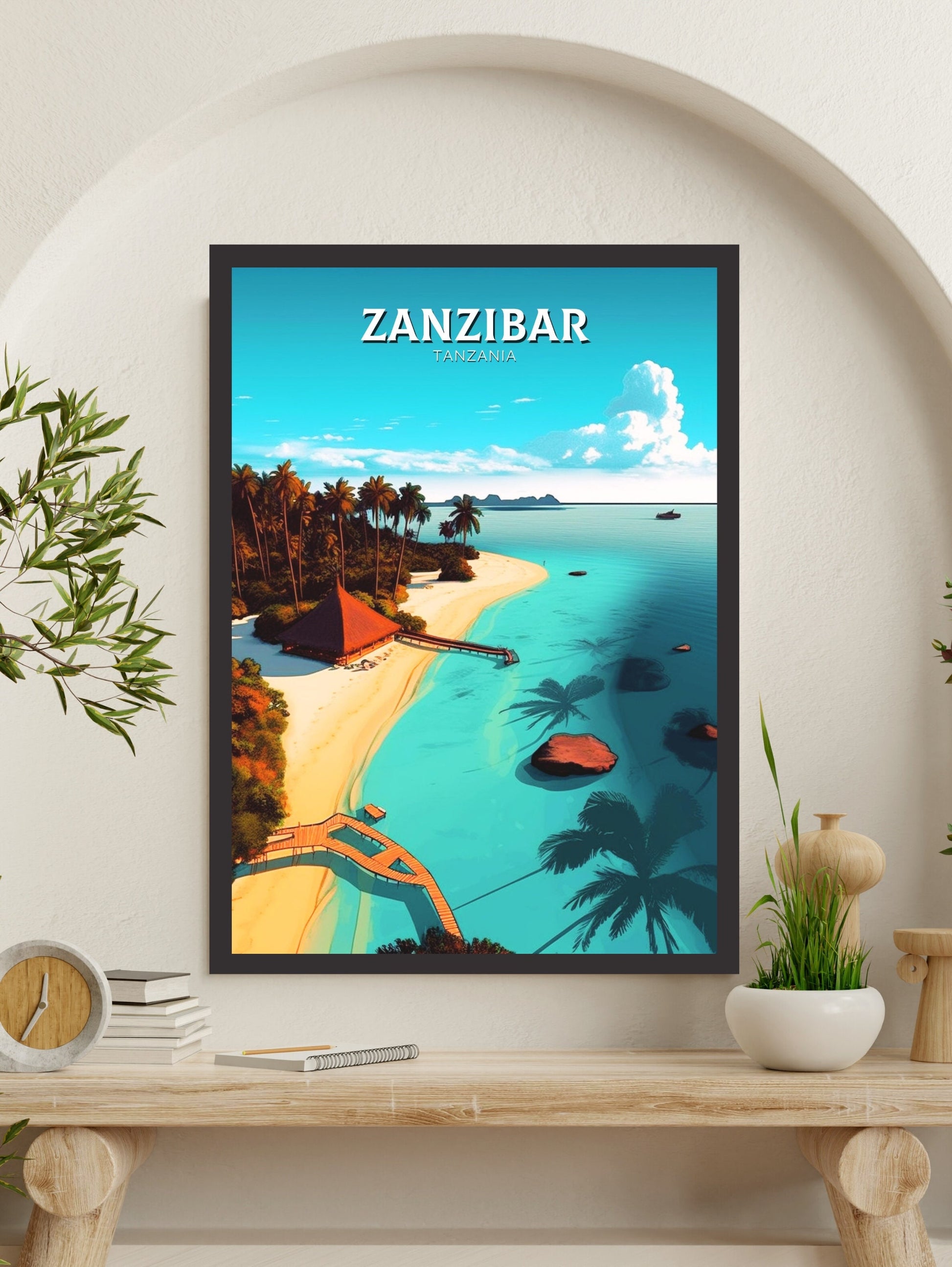 Cette œuvre mêle eaux turquoise et ors chaleureux à l'essence exotique de Zanzibar, évoquant le charme d'un voyage vintage avec une touche de modernité. Imprimée sur un papier de qualité supérieure, elle offre un éclat durable et une finition lisse, ce qui en fait un cadeau idéal pour les aventuriers ou les collectionneurs d'art. Cette affiche de Zanzibar apporte une touche de nostalgie insulaire à tous vos murs.
