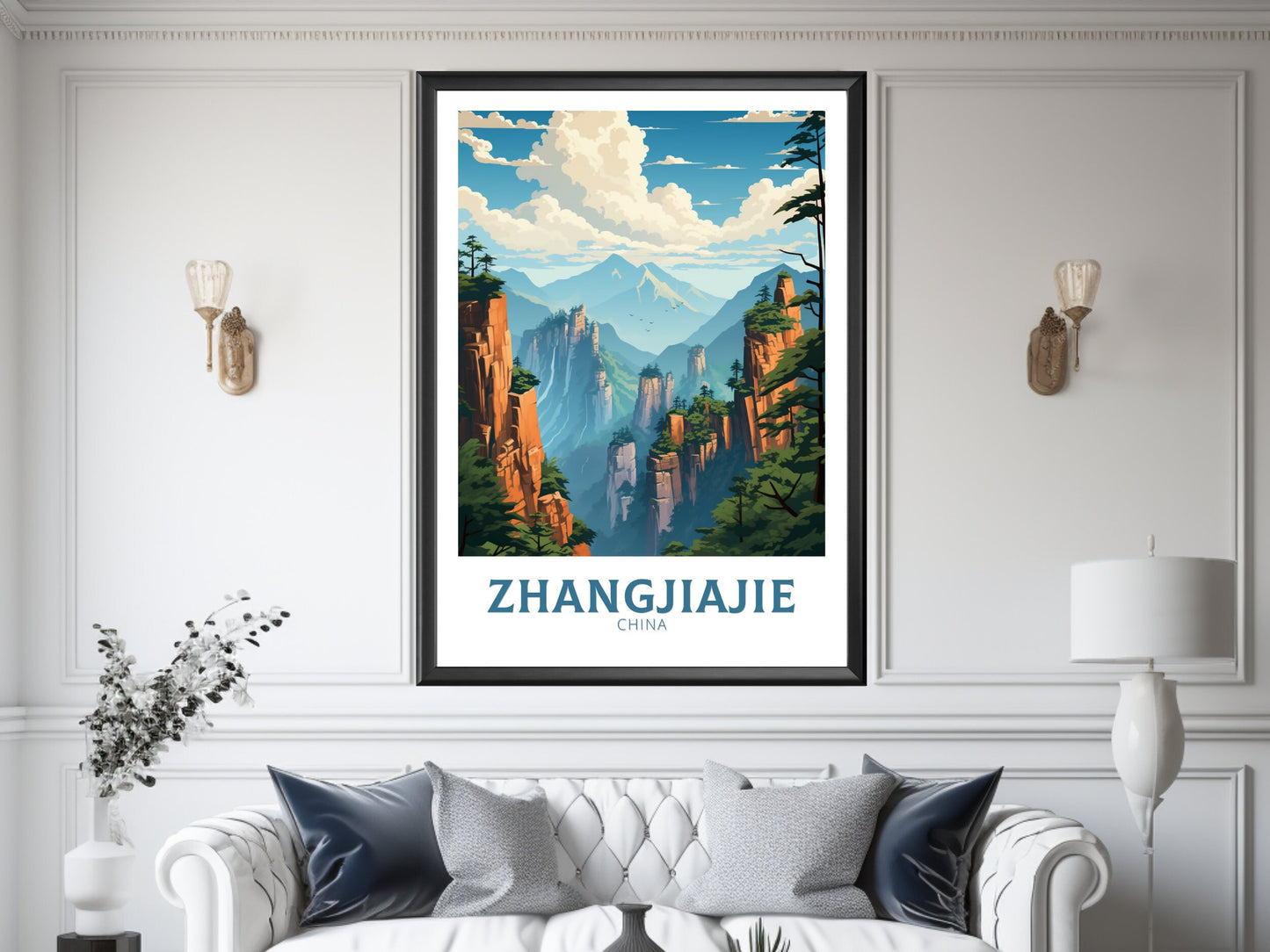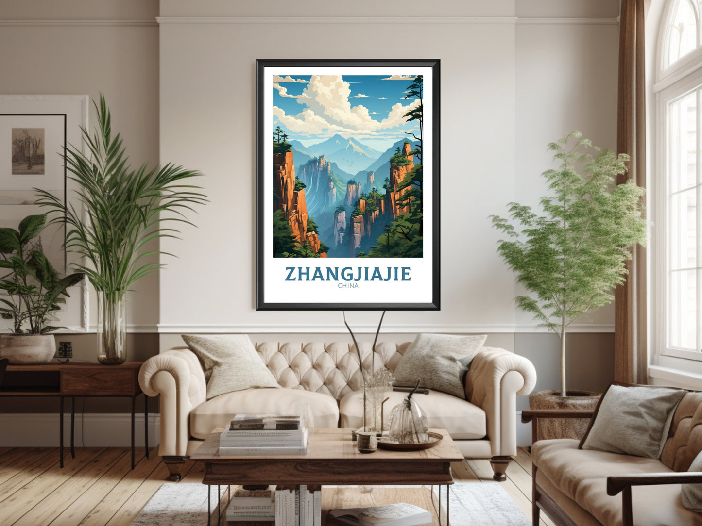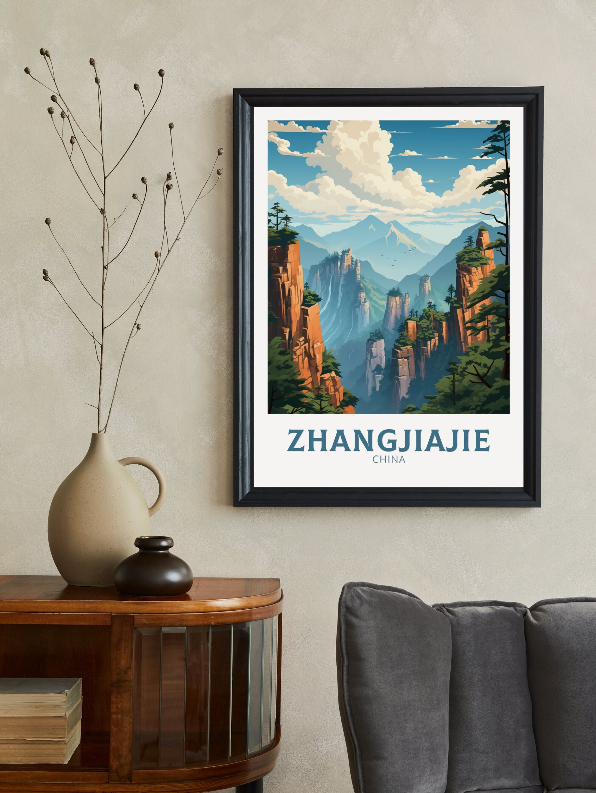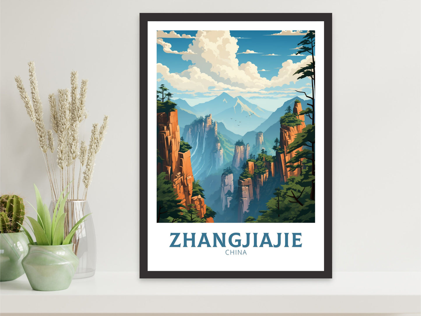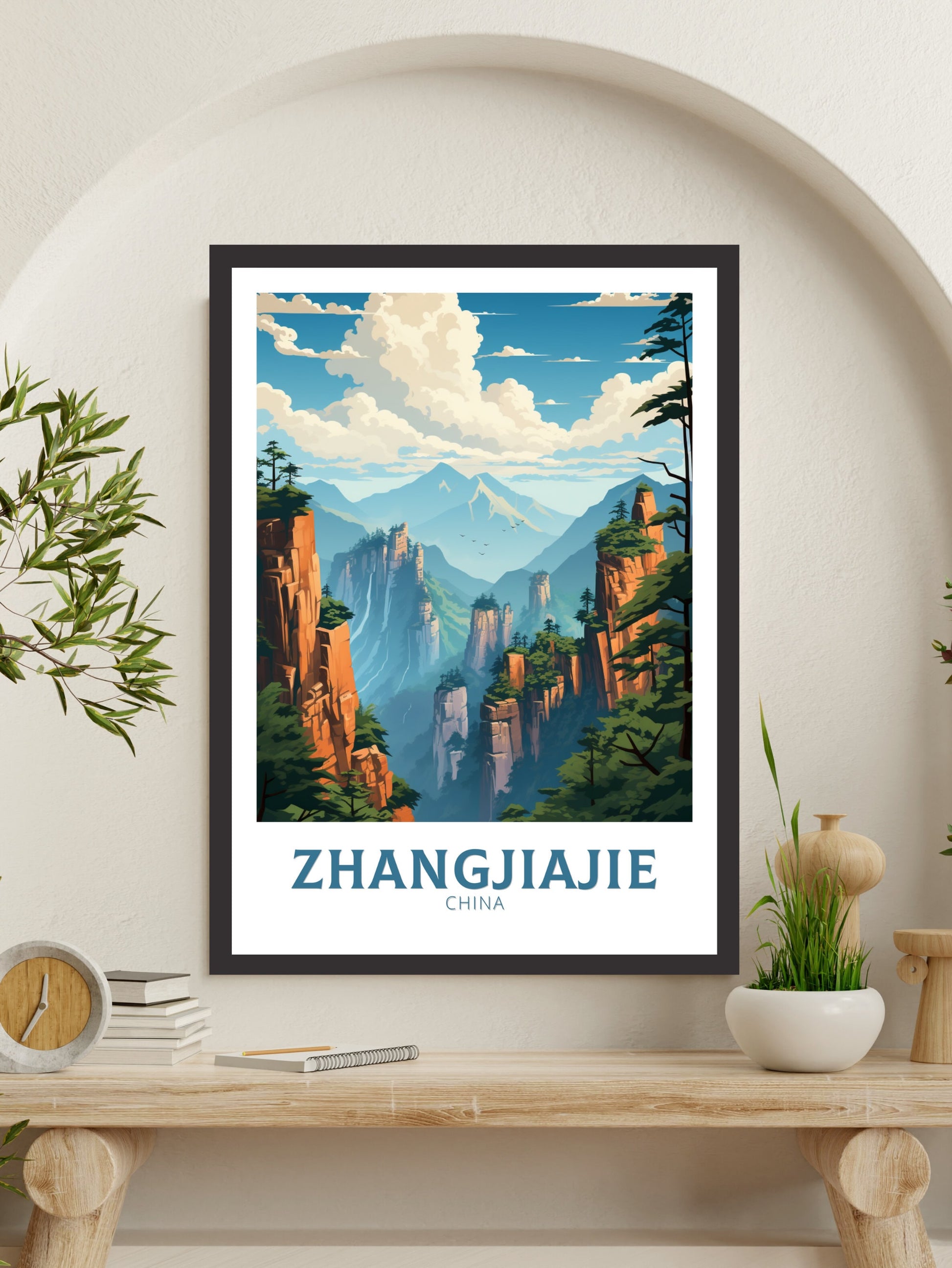 Cette œuvre mêle des verts luxuriants et des gris brumeux à l'essence surréaliste de Zhangjiajie, mettant en valeur sa majesté naturelle dans un style vibrant. Imprimée sur un papier de qualité supérieure, elle offre un éclat durable et une finition lisse, ce qui en fait un cadeau idéal pour les aventuriers ou les collectionneurs d'art. Cette affiche de Zhangjiajie apporte une touche de charme surnaturel à n'importe quel mur.