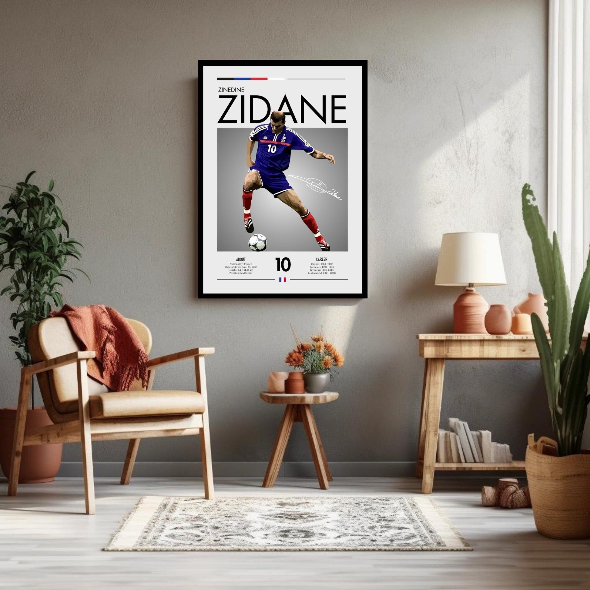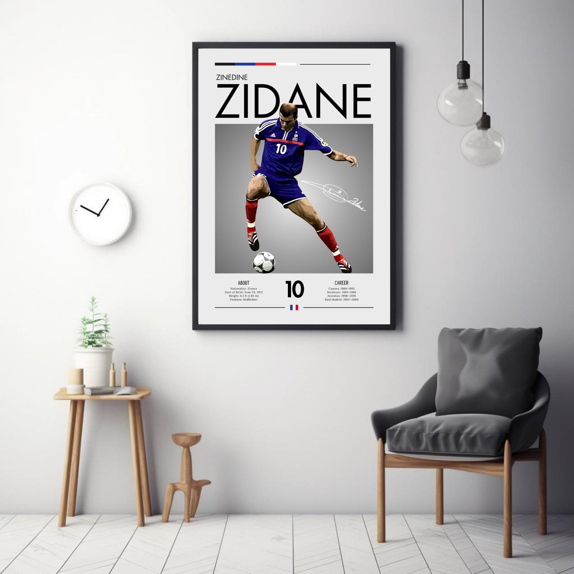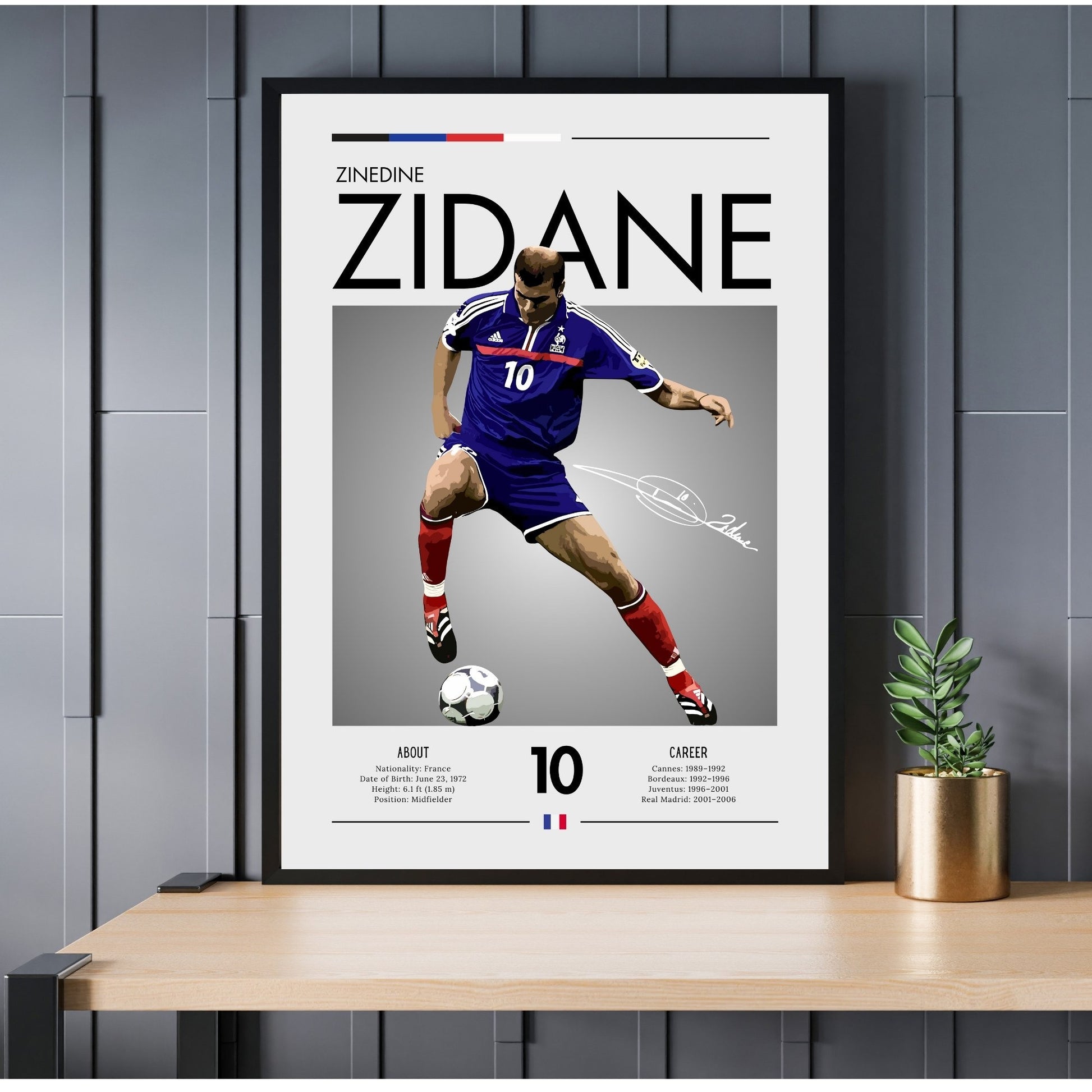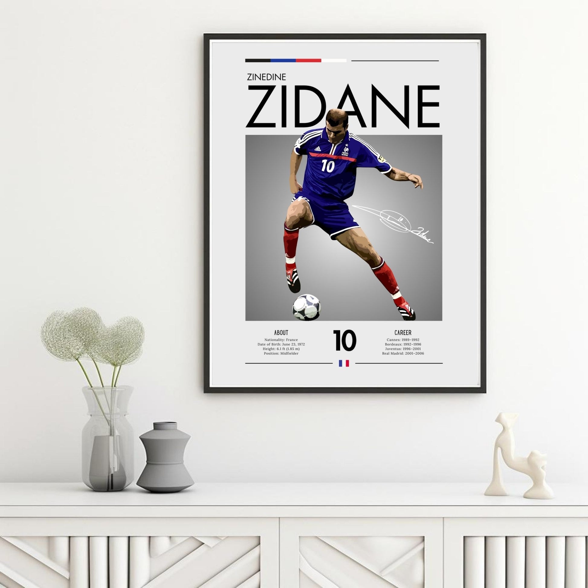 Plongez dans l'illustre carrière de Zinedine Zidane avec cette affiche captivante, mettant en vedette le légendaire footballeur français drapé dans le bleu emblématique de son équipe nationale, sur un fond gris sophistiqué qui dégage une aura d'élégance et de classe.