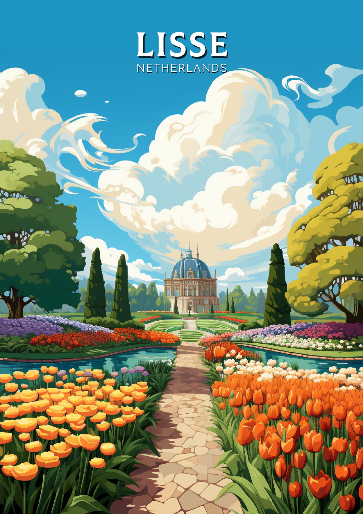 Celebrate the enchanting beauty of Lisse with this Lisse Travel Poster, showcasing the vibrant tulip fields and charming Dutch landscapes that define this iconic Netherland destination. This stunning Netherland artwork captures the essence of Lisse’s colorful springtime scenery, perfect for fans of Dutch travel and floral-themed wall decor.